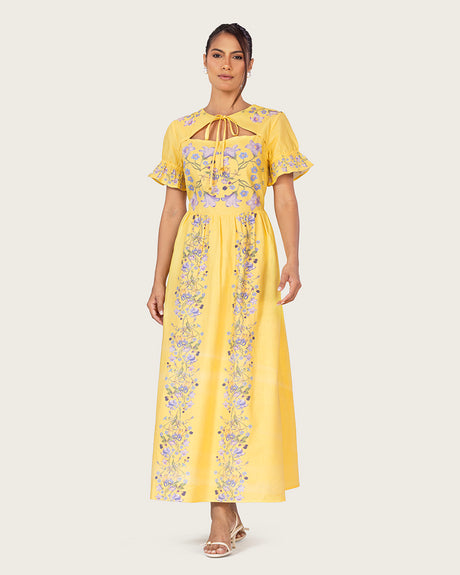 فستان ماكسي أصفر فاتح بتطريز زهري عند الياقة