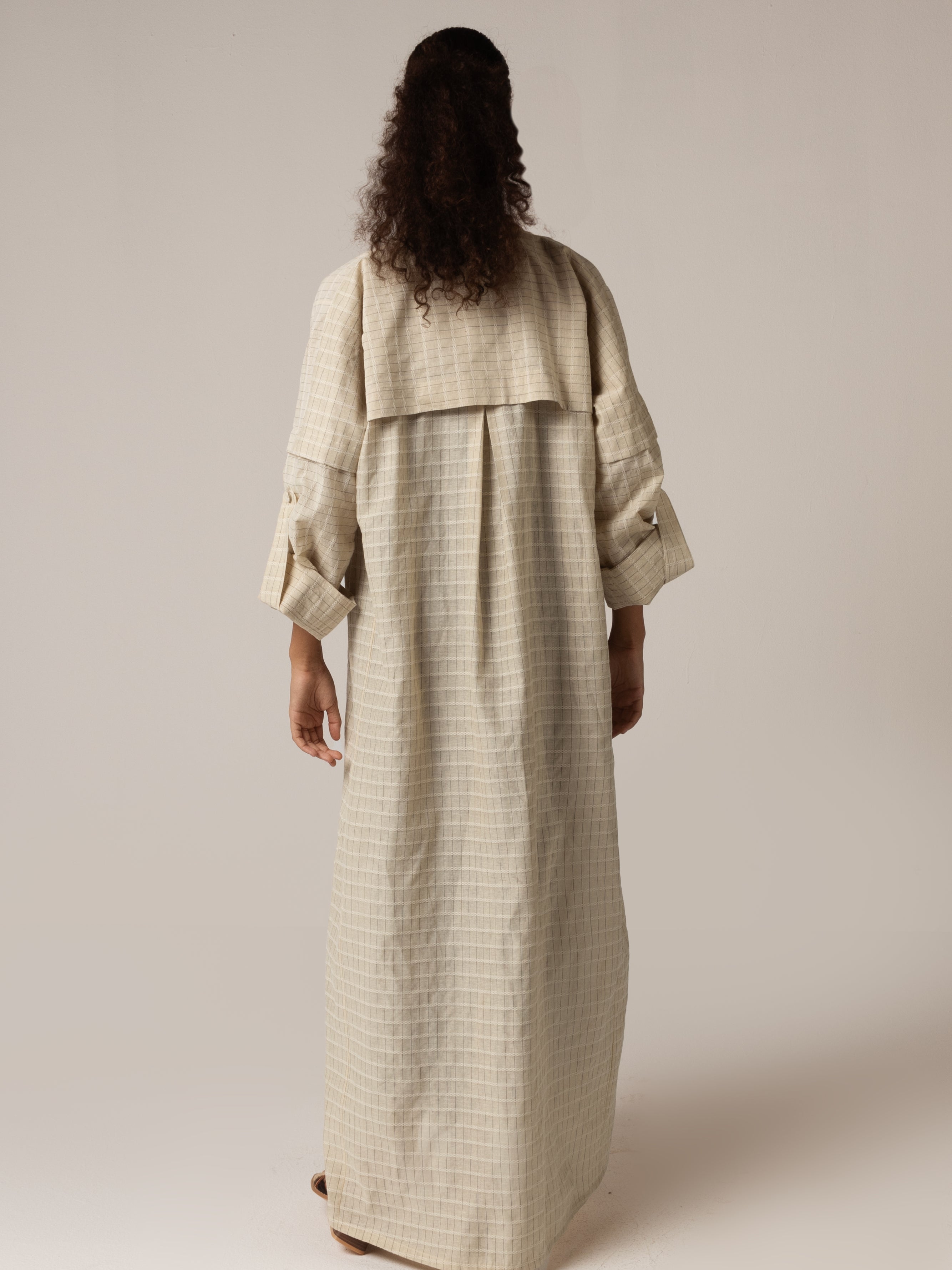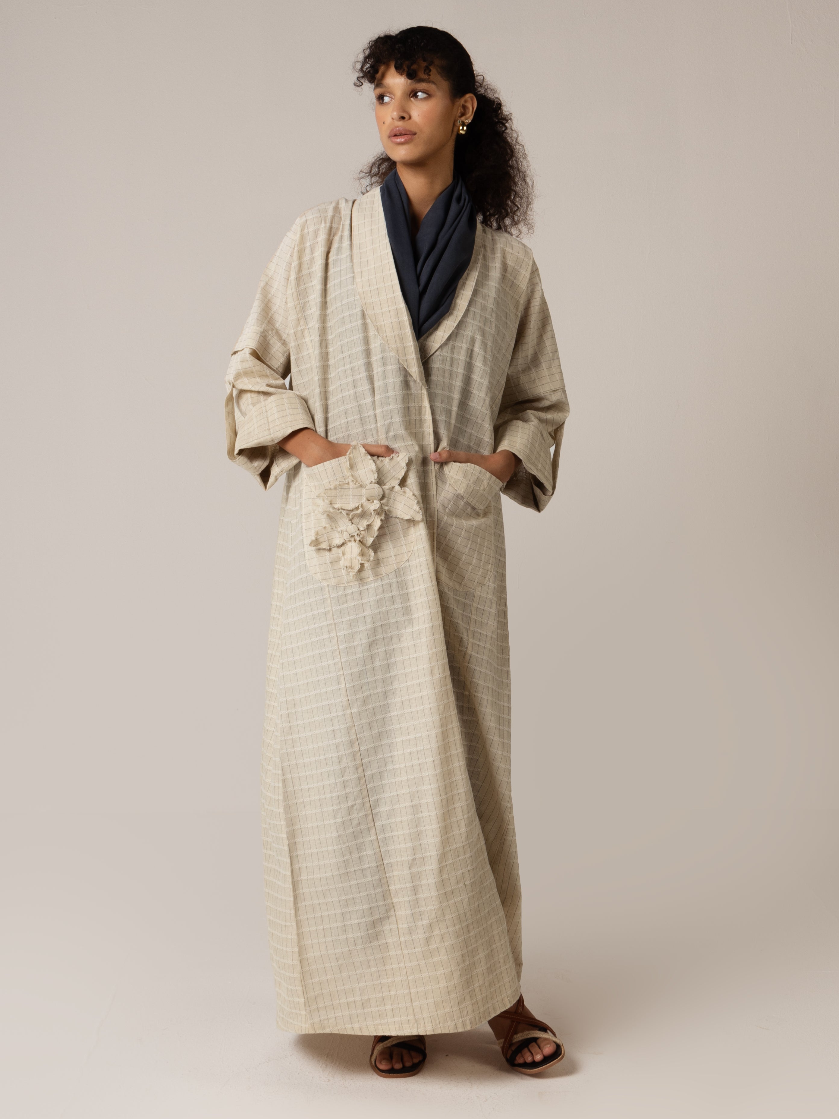 تألقي بإطلالة عصرية تجمع بين الراحة و الأناقة مع هذا التصميم المصنوع من قماش مزيج القطن واللينن. تتميز العباية بأكمام واسعة وجيوب مزينة بورود مصنوعة باليد. سهلة الإرتداء، عملية وتناسب مختلف إطلالاتك اليومية أو امسيات لطيفة مع أصدقائك.