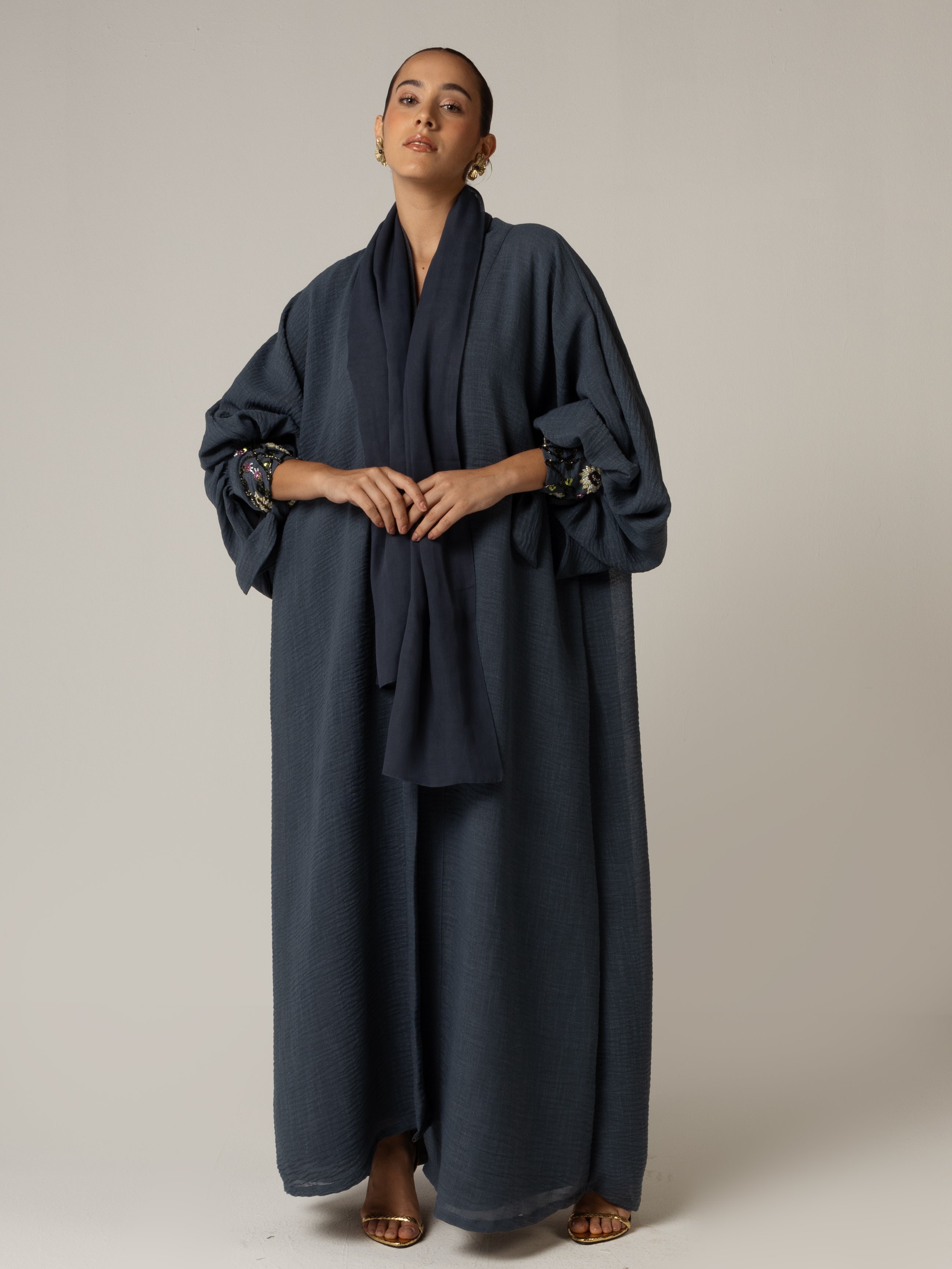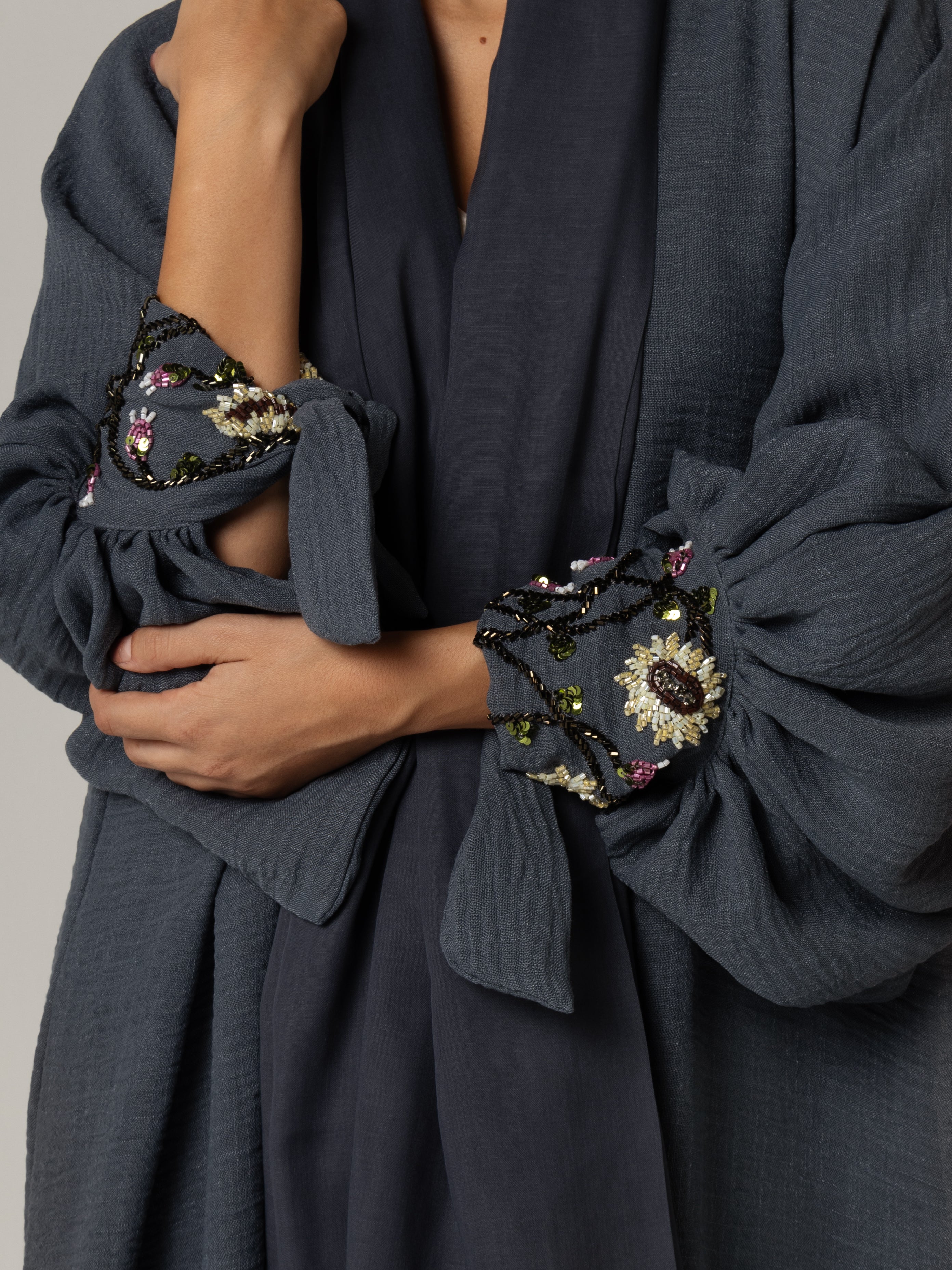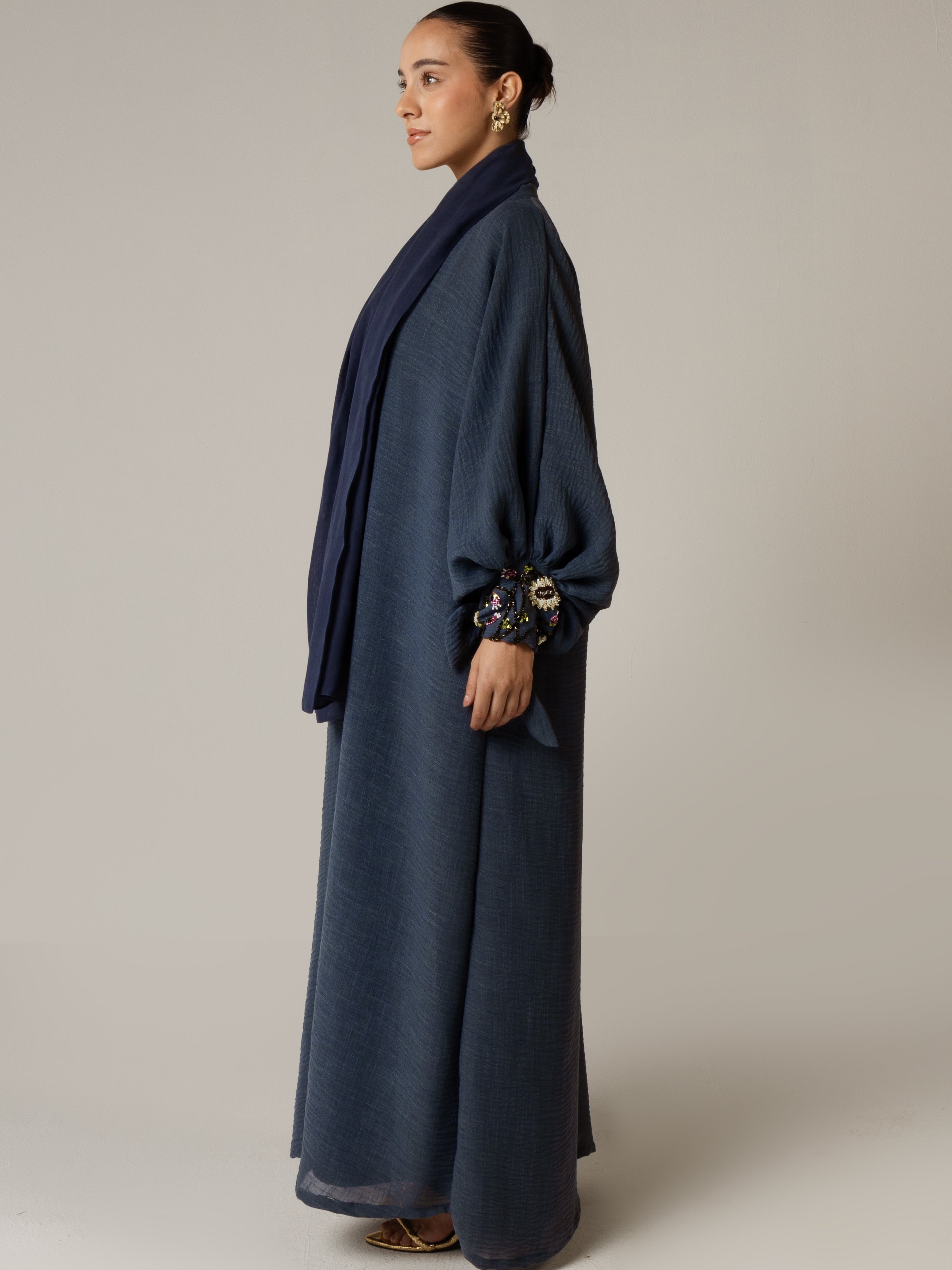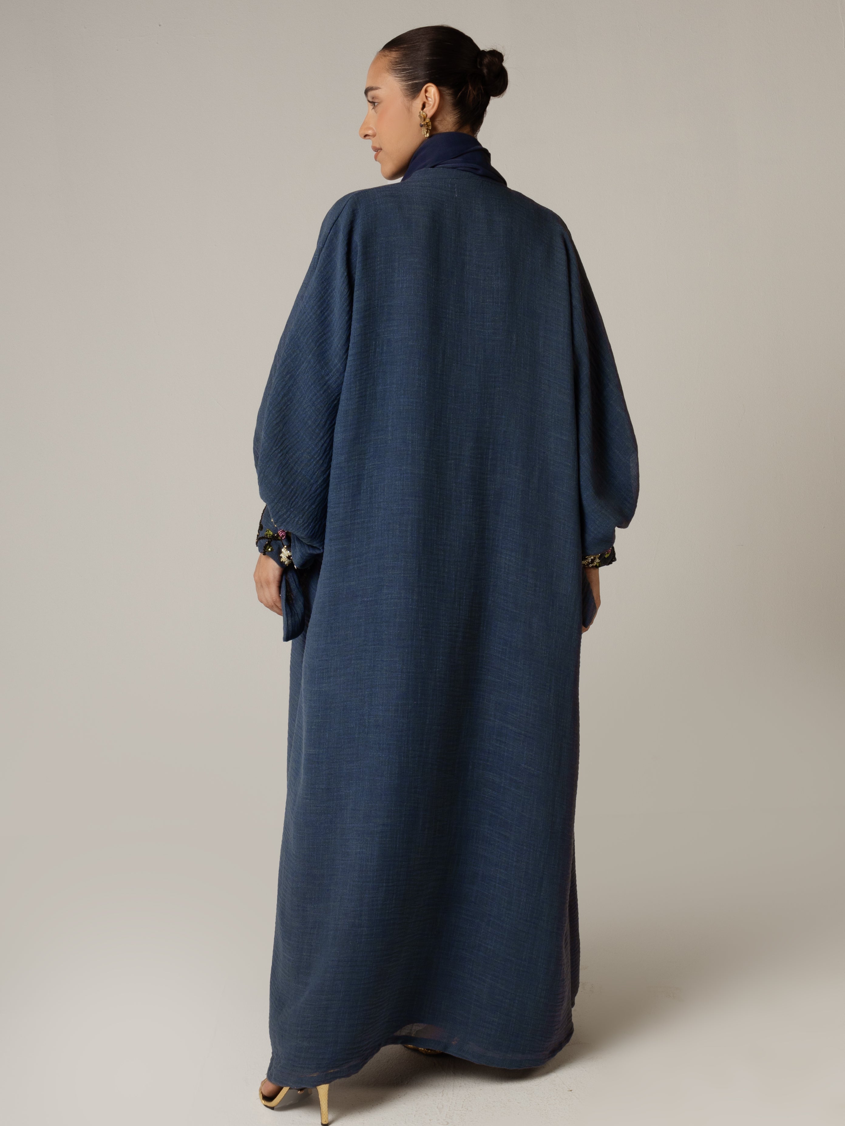 Experience a beautiful fusion of elegance and artistry with our navy blue abaya, featuring intricate sunflower beaded embellishments. With adjustable tie wristbands for a tailored fit, this abaya is perfect for any occasion, whether it's a formal event or a dinner outing. Celebrate your individuality with this exquisite piece that embodies both style and grace.
