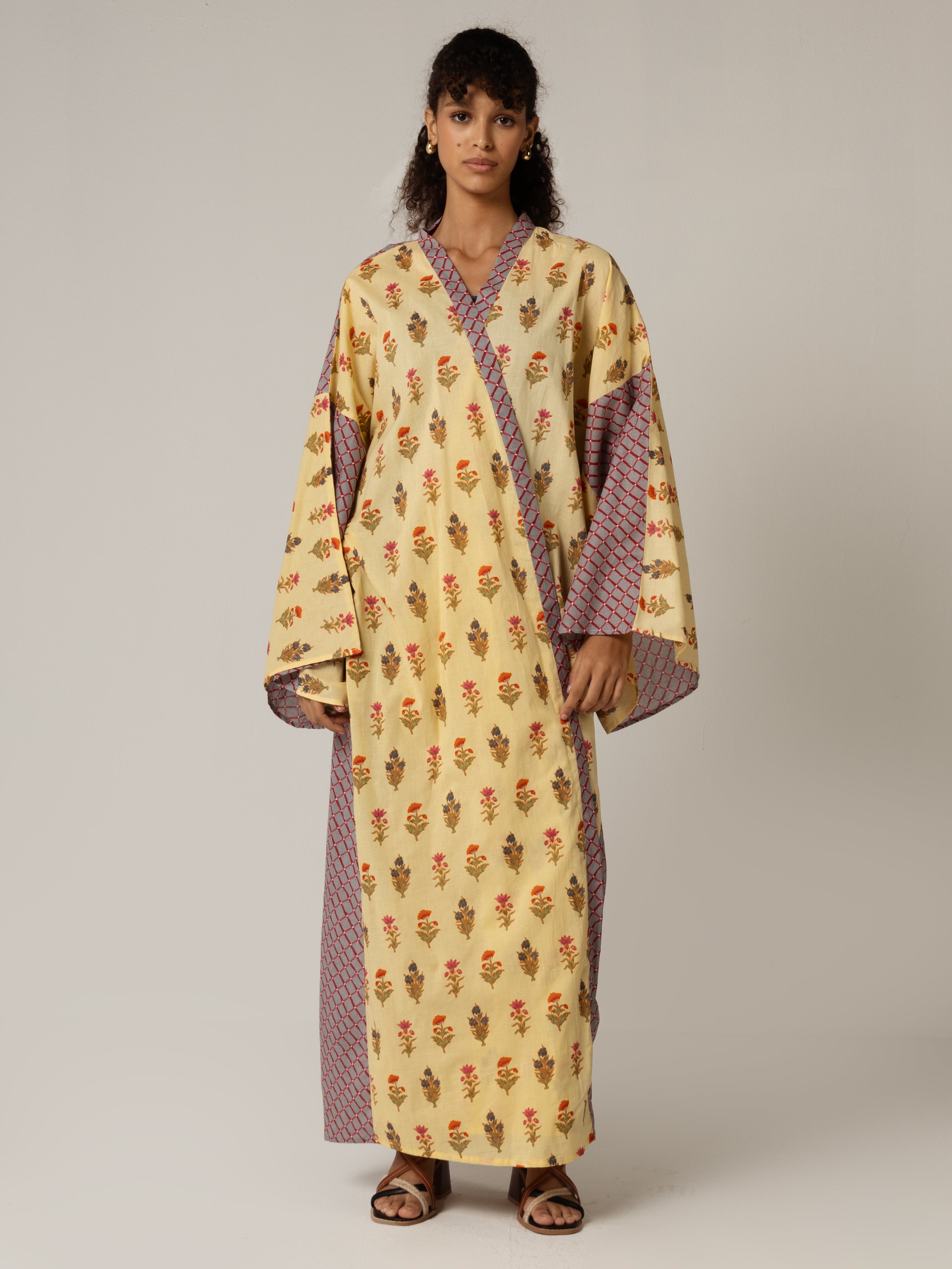 This yellow and blue check block printed kimono abaya is a celebration of artistry and comfort, crafted from soft, breathable cotton. The vibrant block print design adds a bold, artistic flair, making it a standout piece for any wardrobe.