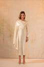 A breathtaking crinkled satin one-shoulder dress in pearl white. The striking asymmetrical design features a long off-shoulder sleeve on one side, while the other side showcases a dramatic cape-like bell sleeve that cascades beautifully, creating an enchanting silhouette. This dress is perfect for making a statement at formal events and Eid evening dinners.