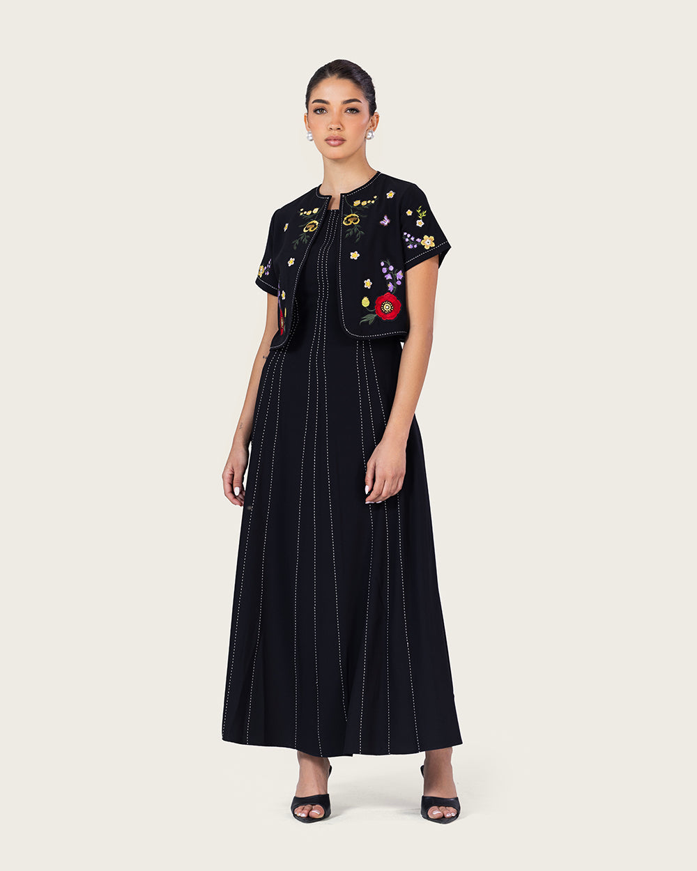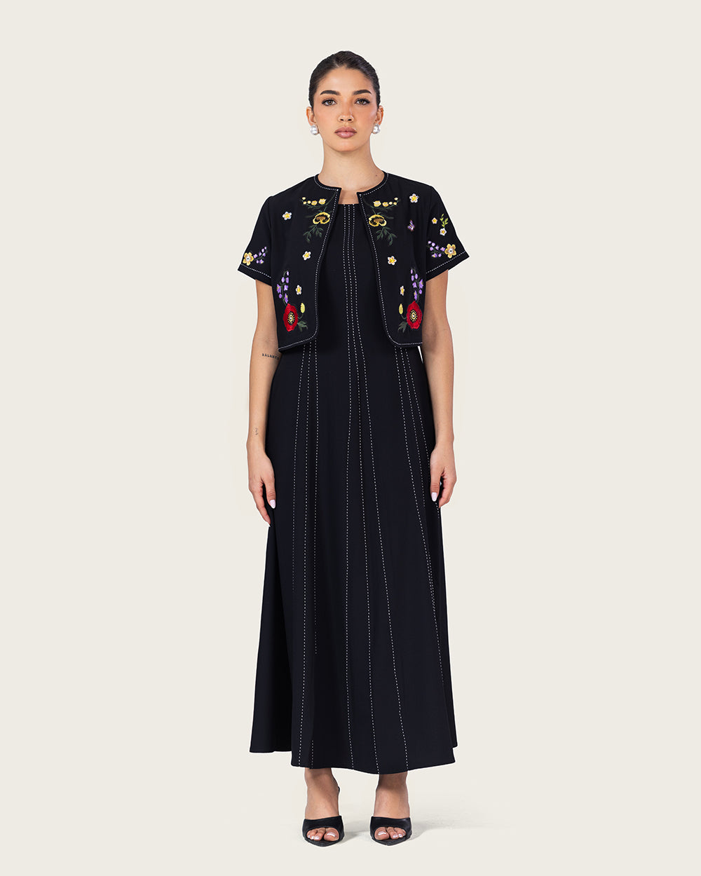 فستان أسود مطرز مع جاكيت قصير للعيد – أناقة راقية لكل مناسبة