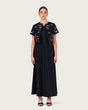 فستان طول الكاحل  أسود بتفاصيل تطريز دقيقة وخطوط طولية تمنح إطلالة أكثر انسيابية وأناقة.