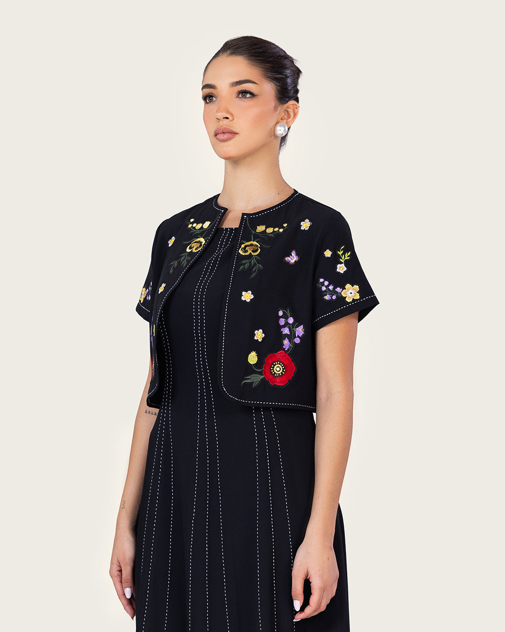 يأتي مع جاكيت قصير مطابق مزين بتطريزات زهرية ناعمة، ليشكل طقمًا مكونًا من قطعتين يجمع بين البساطة والفخامة. اللون الأسود الكلاسيكي يجعله خيارًا مثاليًا للمناسبات الرسمية والسهرات الراقية.