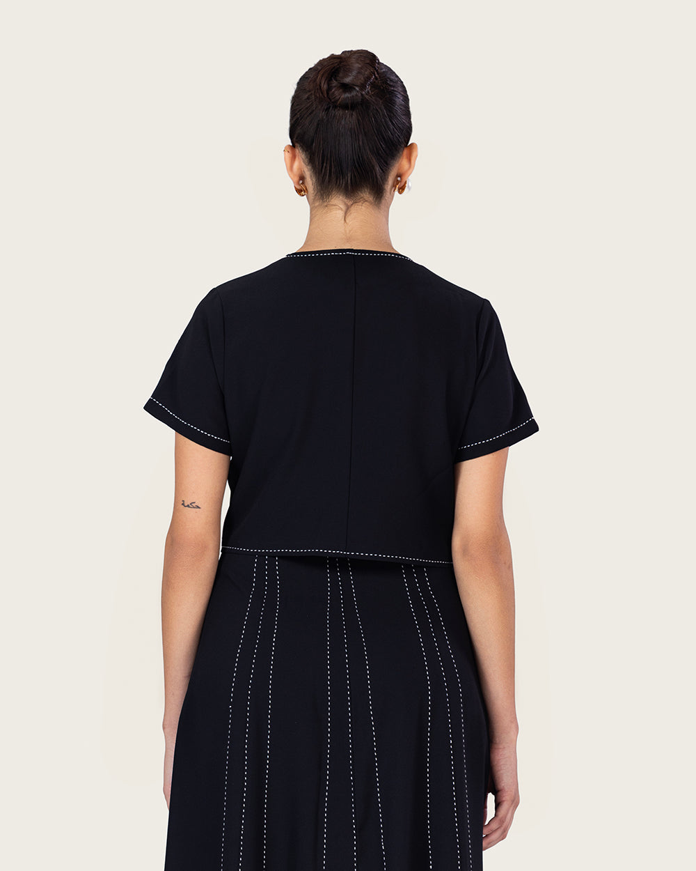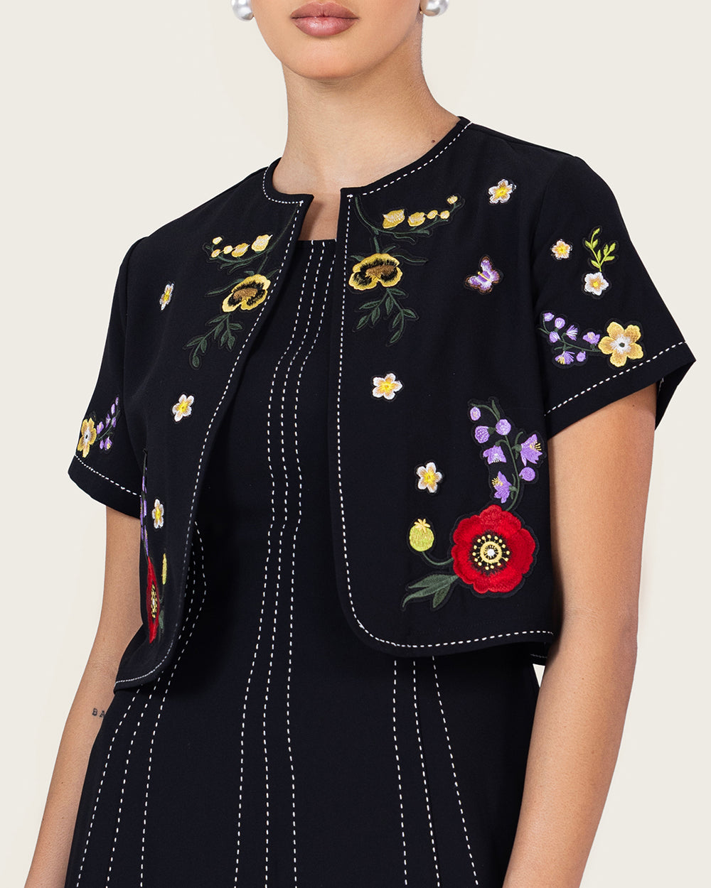 Paired with a matching cropped jacket featuring delicate floral embroidery, this two-piece set combines classic structure with feminine artistry. The minimalist black base makes it versatile, while the embroidered jacket adds a refined statement touch.