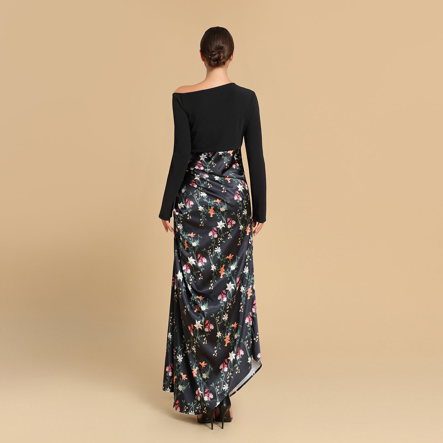Modern sophistication with a touch of romantic charm. This look pairs a sleek black knit top with a lustrous floral satin skirt, gracefully draped to accentuate the waist. An elegant composition of contrast — effortless, feminine, and endlessly versatile.