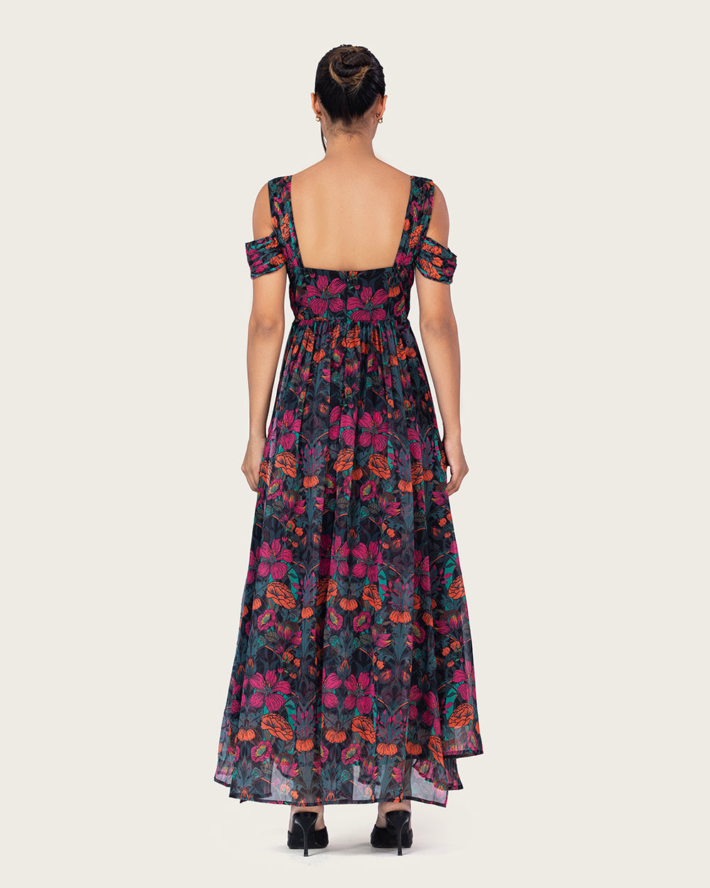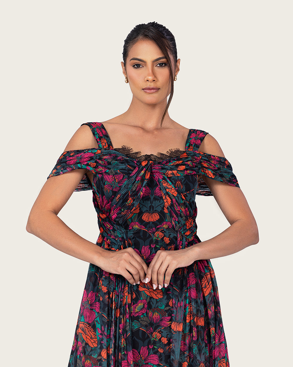 تصميم أنثوي راقٍ مصنوع من قماش الشيفون الخفيف، ينساب بحركة ناعمة تعكس الأناقة بكل بساطة. يتميّز بياقة مكشوفة الأكتاف مع تفاصيل كشكشة ناعمة، وتنورة واسعة بطبعات زهرية أنيقة على خلفية داكنة عميقة تضيف لمسة فاخرة وجذابة. خفيف، مريح، وانسيابي — مثالي للأمسيات والمناسبات واللحظات المميزة.
