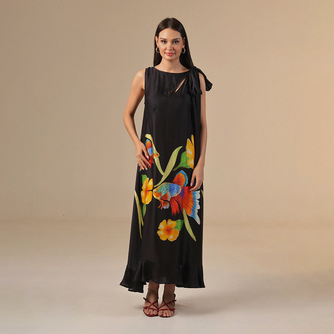 يتميز هذا الفستان بطبعة فنية صممت حصرياً لعلامة نويتك، حيث تتناغم رسومات الأسماك والزهور النابضة بالألوان مع الخلفية السوداء الفاخرة في لوحة فنية ساحرة. يأتي بقَصّة انسيابية ناعمة تمنحك حرية الحركة وانسيابية راقية في الإطلالة. يزدان بربطة على الكتف بالامكان التحكم بها بربطها او تركها منسدلة ، و فتحة على الصدر تمنحك لمسة أنثوية أنيقة تناسب الأمسيات الصيفية أو الإطلالات المميزة التي تبحث عن التفرد والتميّز في التفاصيل