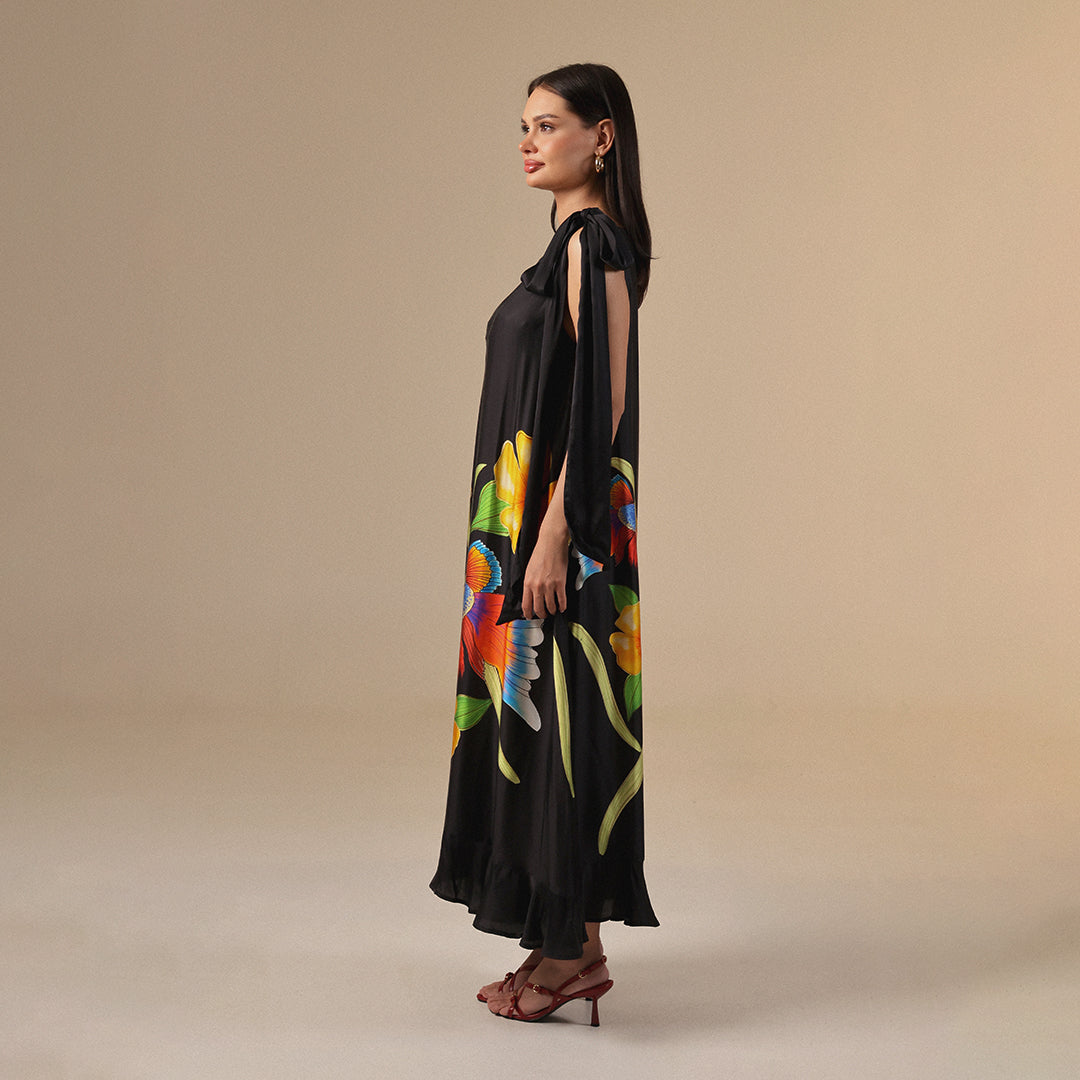 This striking black maxi dress showcases bold floral and fish motifs that bring a vibrant splash of color to any occasion. The relaxed silhouette offers both comfort and style, making it a perfect choice for casual outings or evening events. A timeless piece that effortlessly combines elegance with the neck tie detailing.