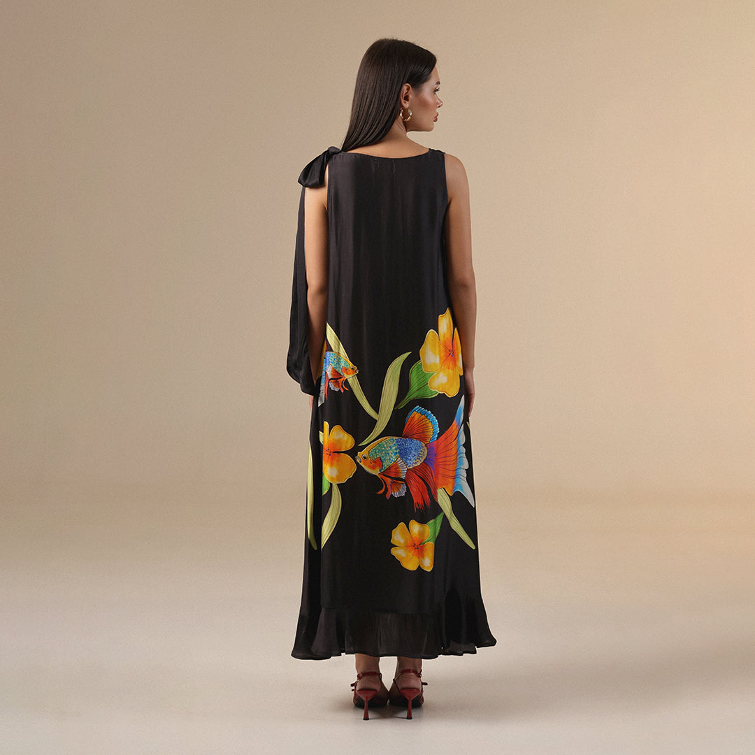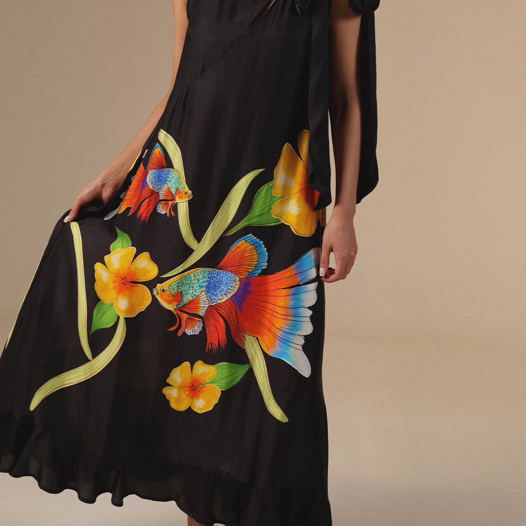 فستان اسود حريري بطبعة أسماك زاهية