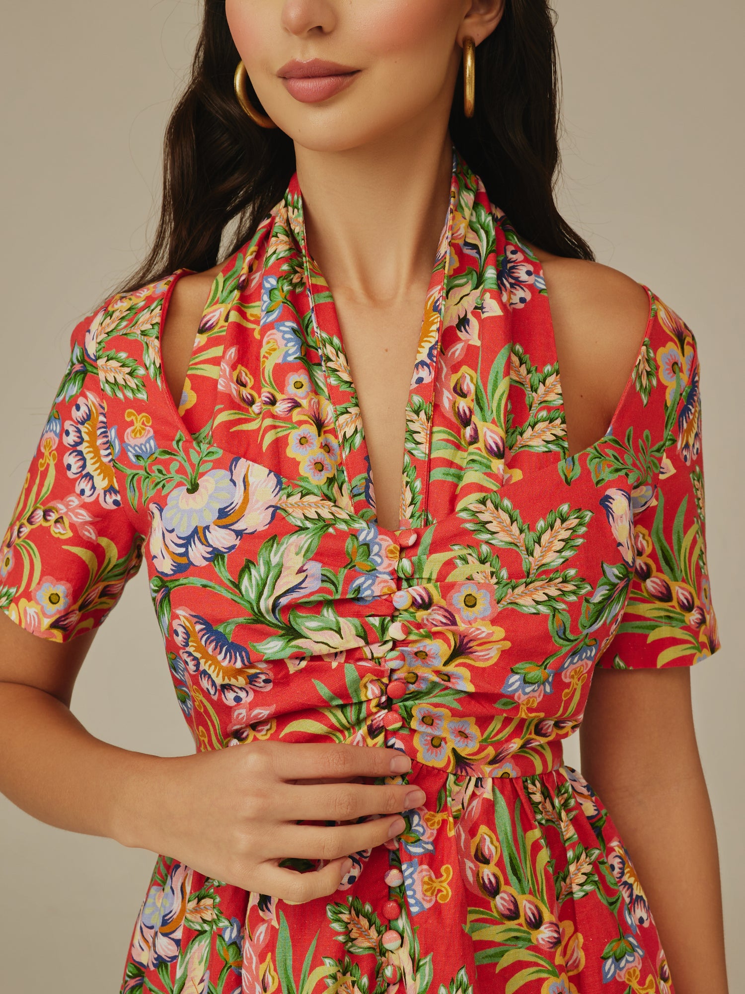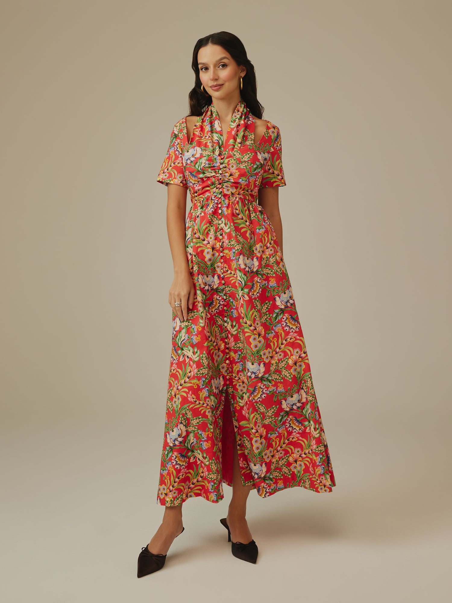 Cut from breathable linen, this maxi dress combines comfort with standout style. Featuring a vibrant floral print, ruched detailing at the bust, and a halter-inspired neckline, it’s designed to flatter while keeping you cool. The side pockets make it an easy choice for everyday wear. Perfect holidays, or casual evenings out.