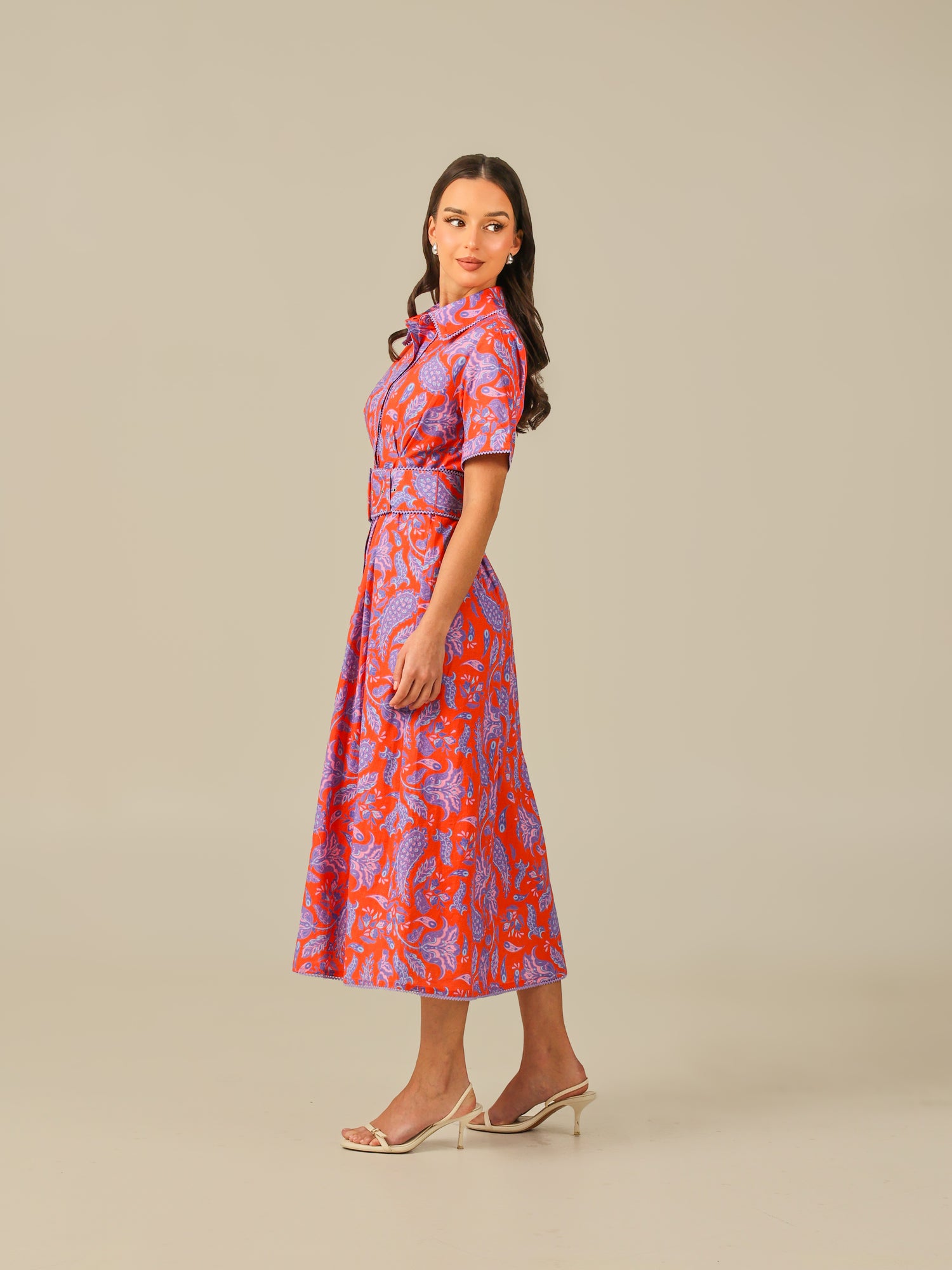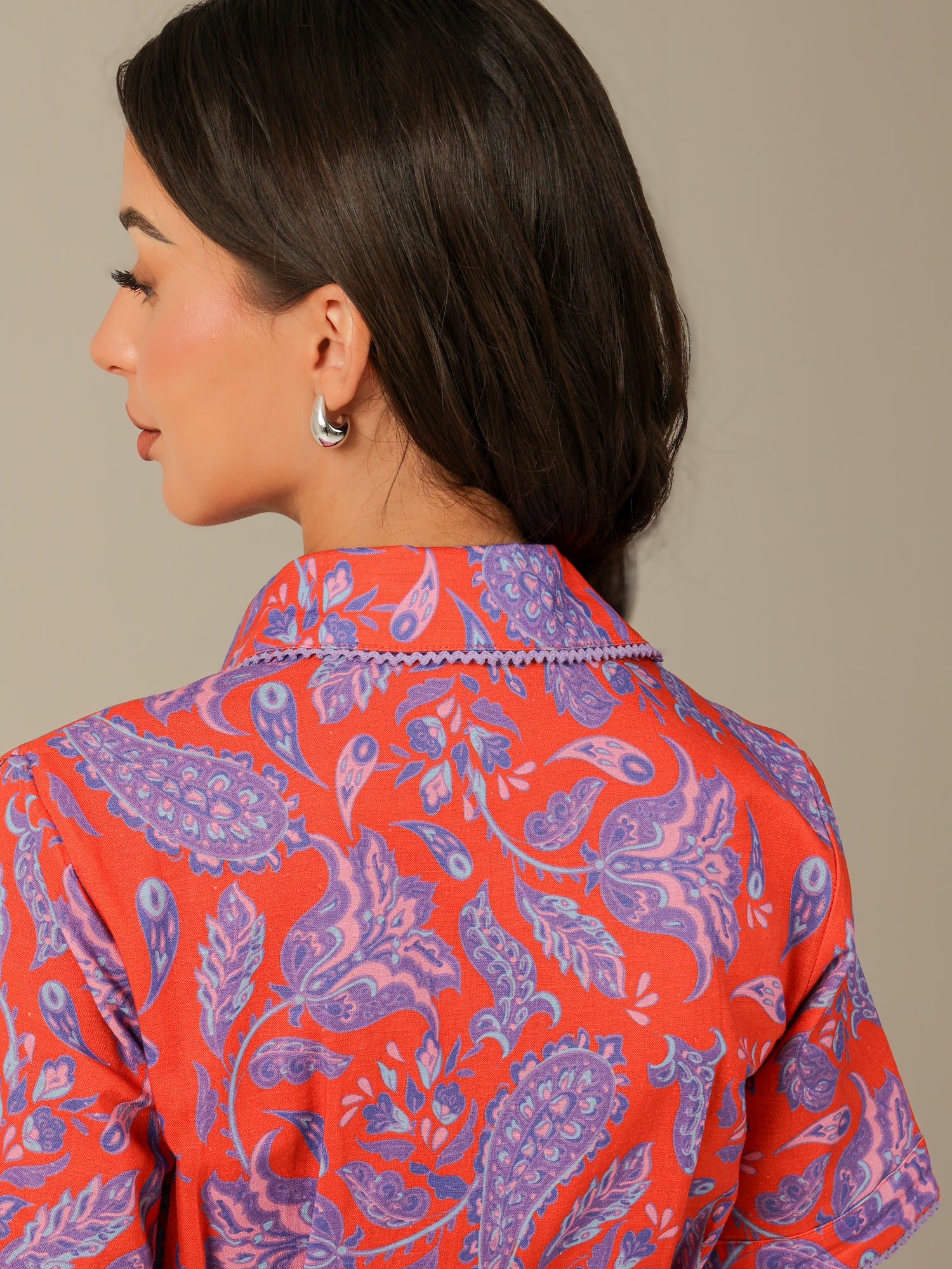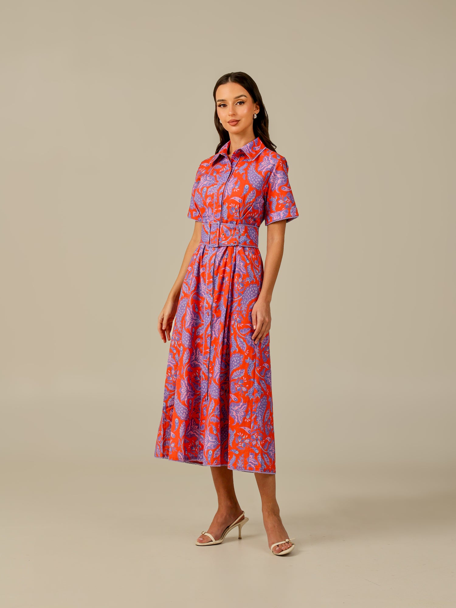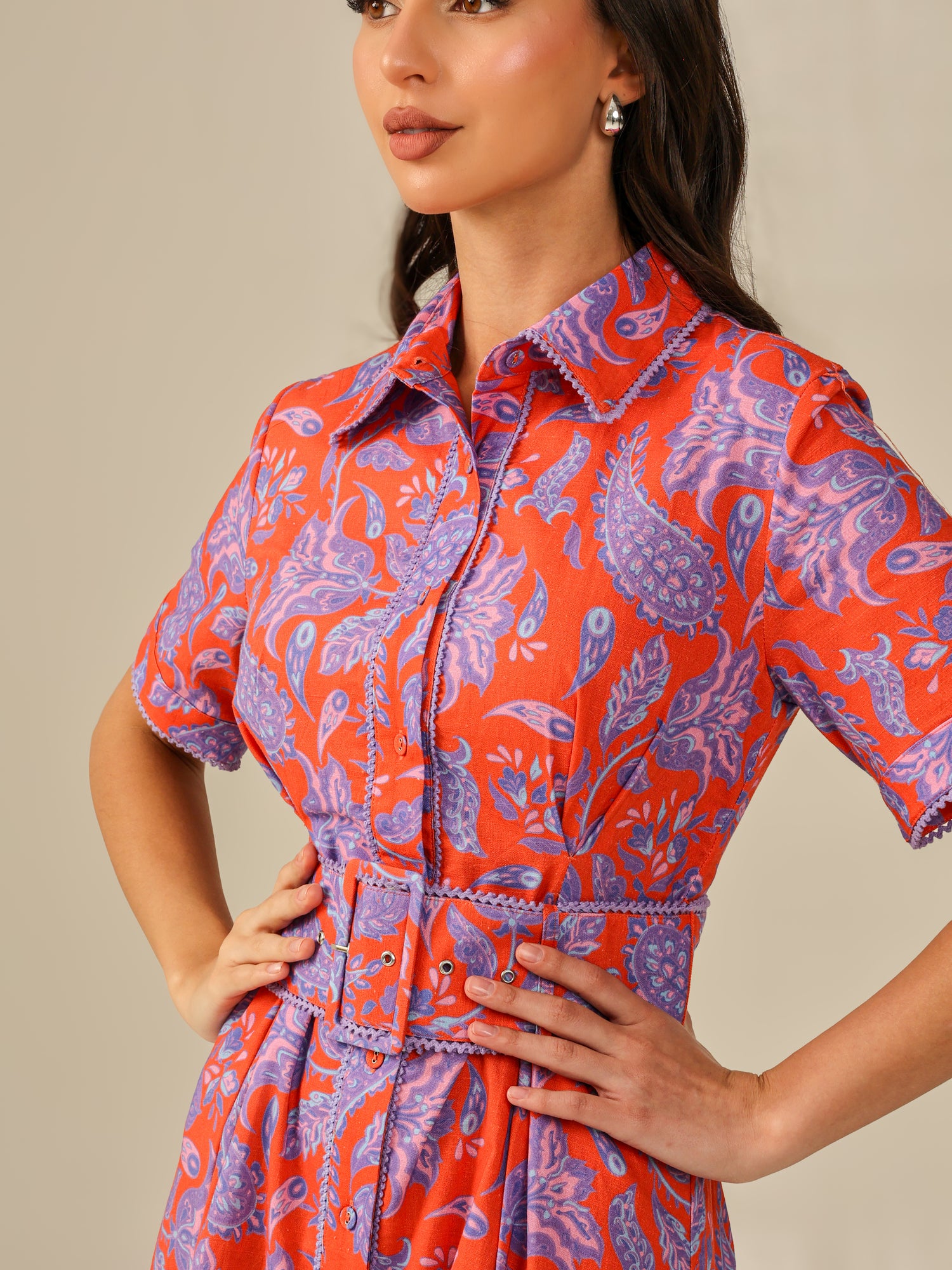 This striking dress is crafted from breathable linen and features a bold, colorful print in vibrant shades of red and purple. The structured silhouette includes a classic shirt collar, short sleeves, and a flattering midi length. Thoughtful details like delicate crochet trims add a subtle artisanal touch, while the matching self-fabric belt cinches the waist to create a beautifully defined shape. Equal parts playful and polished, this dress is perfect for daytime events or chic summer outings.