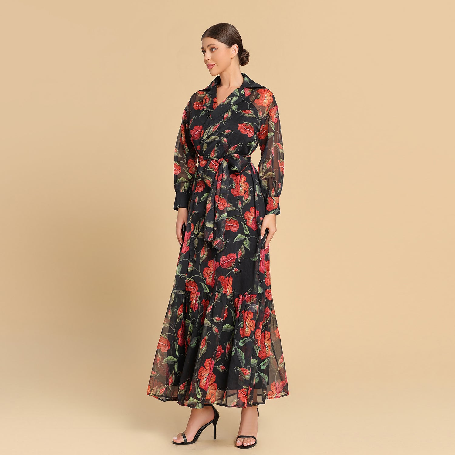 A timeless wrap dress reimagined in sheer printed chiffon. The deep floral tones bloom beautifully against a dark backdrop, while the belted waist and tiered hem evoke refined femininity. A statement of poise and allure — perfect from day to evening.