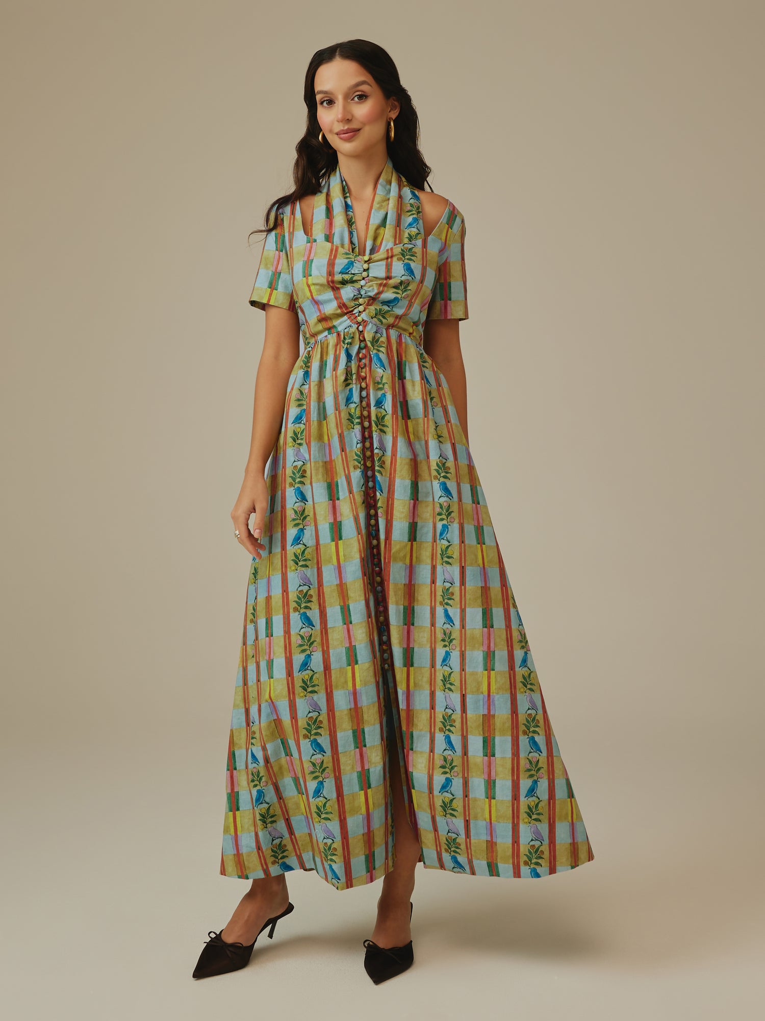 Crafted from breathable linen, this maxi dress blends modern checks with delicate embroidered florals. Designed with a ruched bust and halter-inspired neckline, it flatters the silhouette while offering all-day comfort. The flowing skirt creates effortless movement, and practical side pockets add functionality.