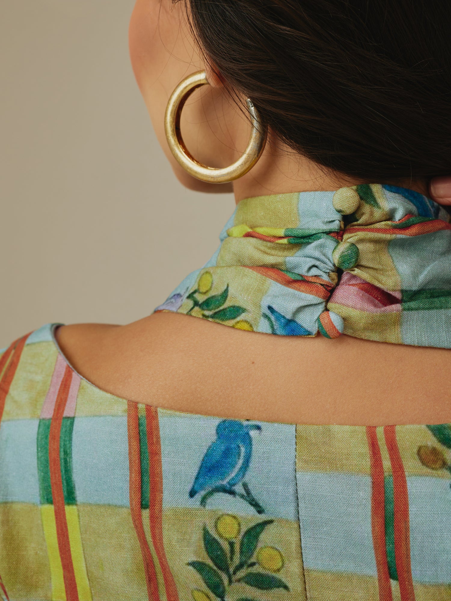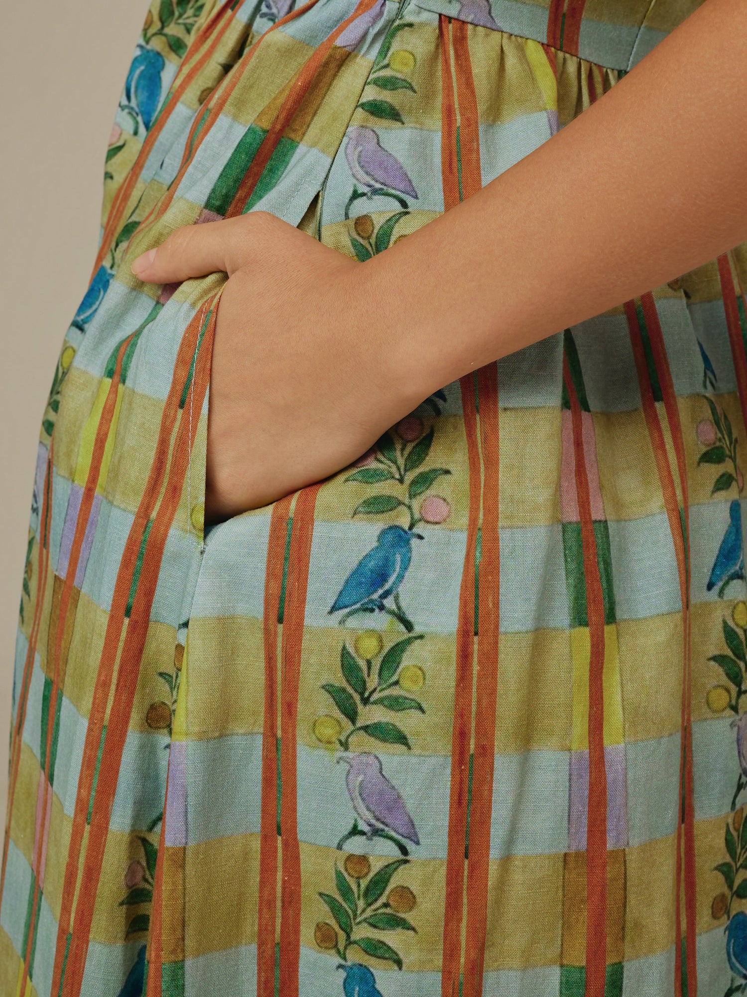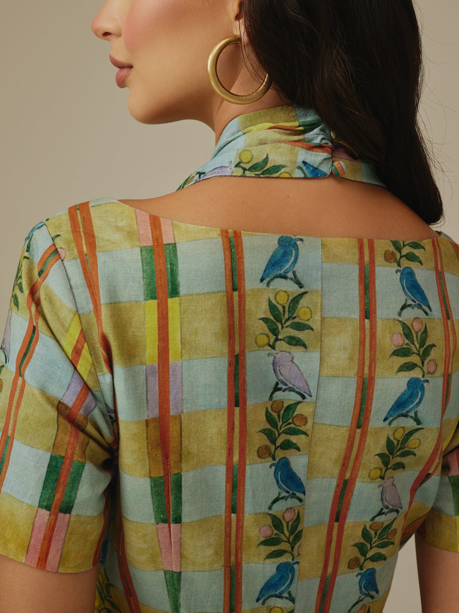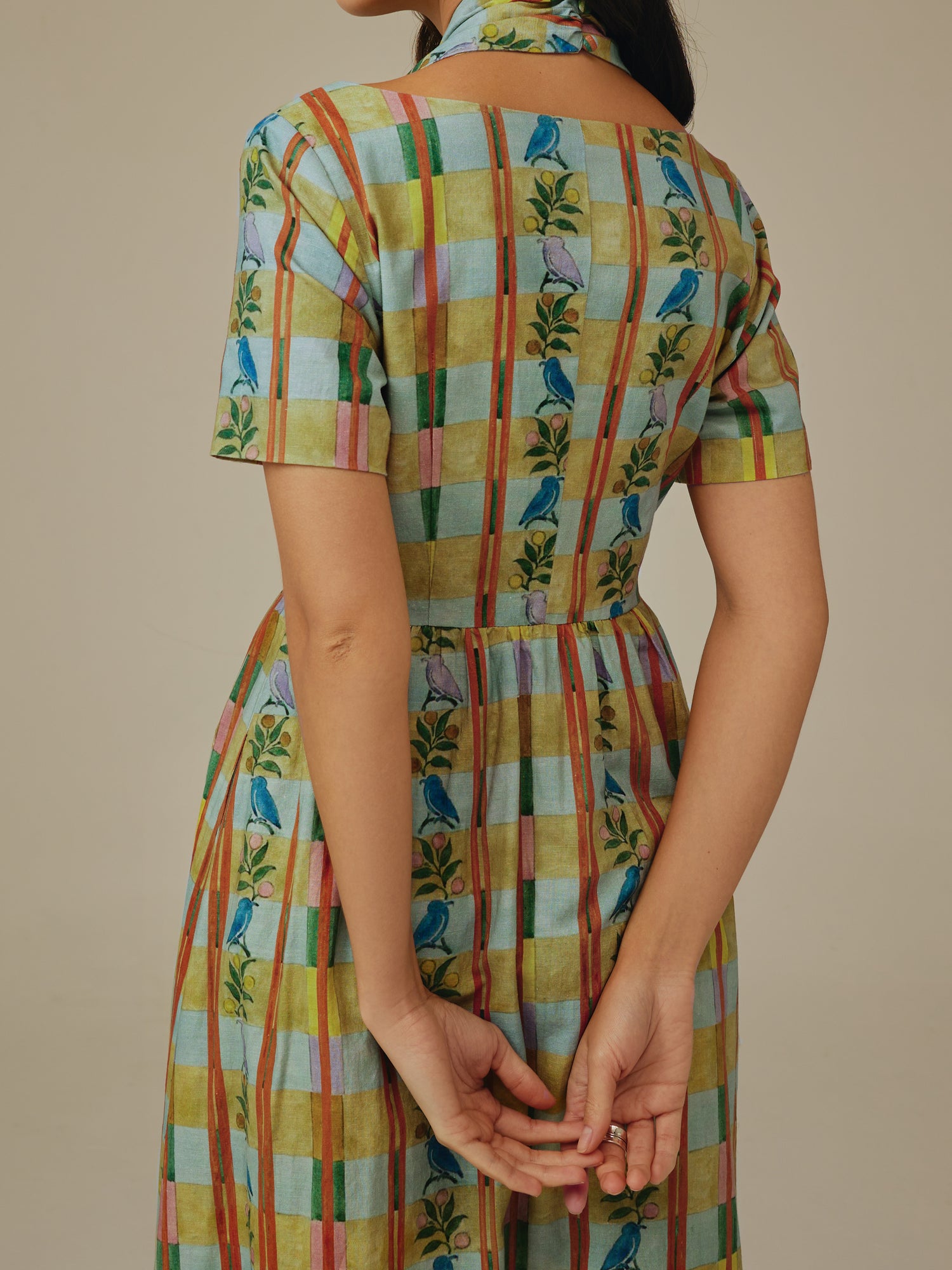 مصنوع من قماش الكتان، يجمع هذا الفستان بين نقشة المربعات العصرية والتطريزات الزهرية الناعمة. يتميز بكشكش عند الصدر مع فتحة و ربطة العنق لخطوط أنثوية أنيقة، مع تنورة واسعة تضيف انسيابية وحركة مريحة. الجيوب الجانبية تضيف لمسة عملية.