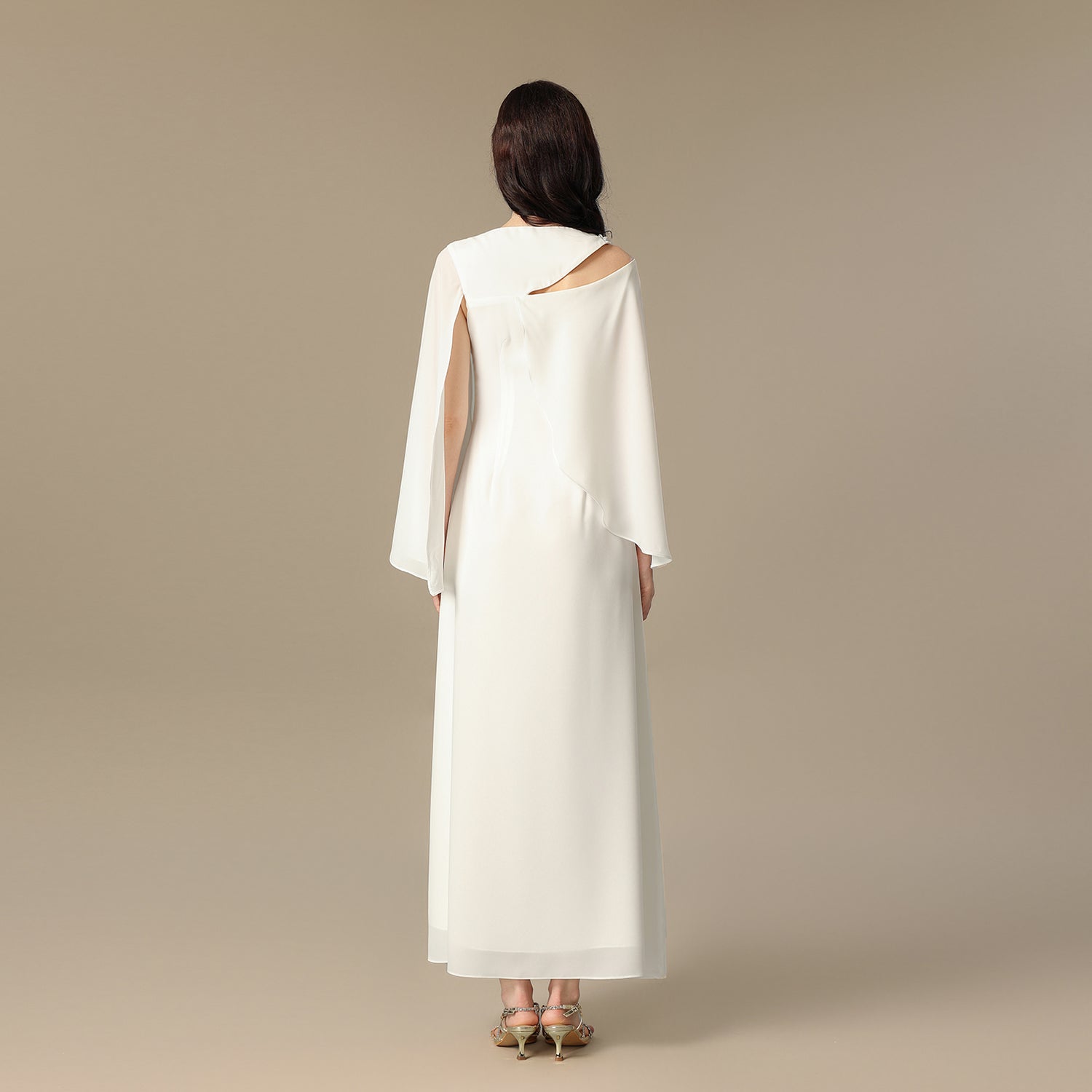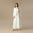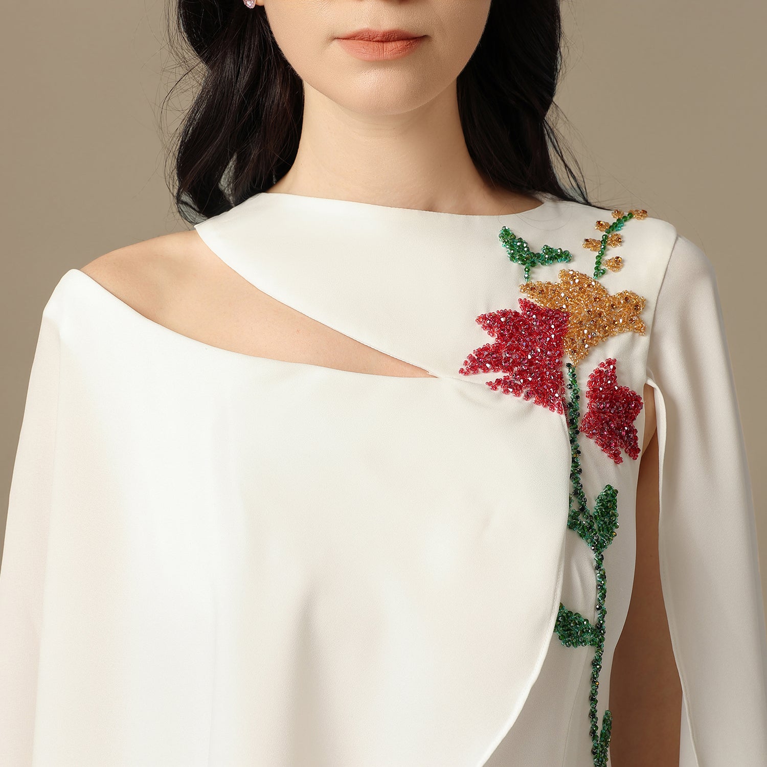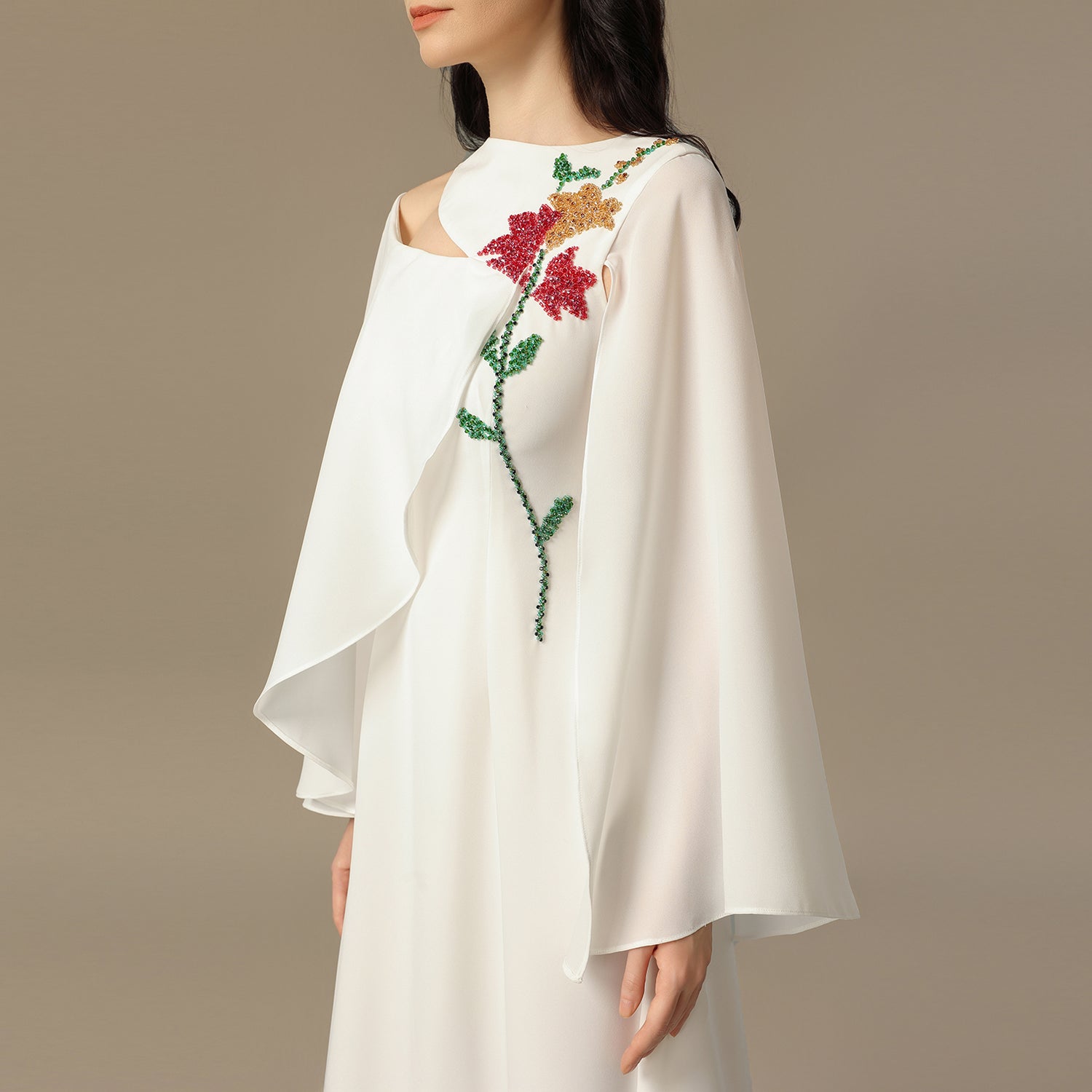 A refined silhouette crafted from luxurious crepe, designed to drape effortlessly with every movement. This piece features hand-placed embellishments that bring the floral motif to life with subtle sparkle and depth. The asymmetric cape sleeves add a modern, sculptural touch, creating a timeless statement that blends elegance, artistry, and quiet confidence.