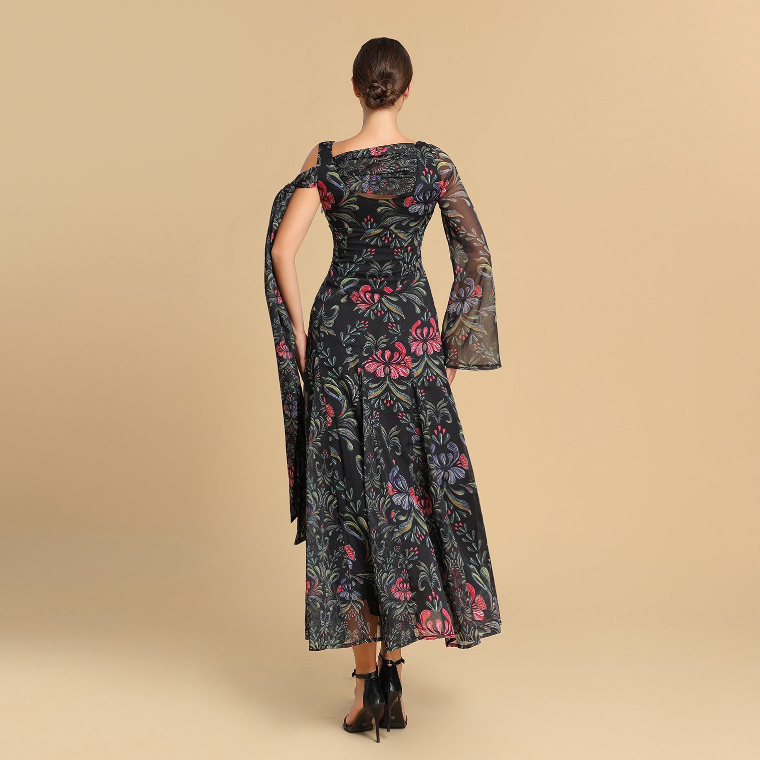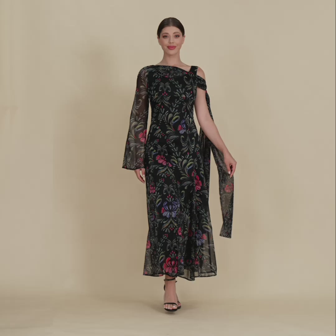 A graceful silhouette adorned with soft floral prints on airy chiffon. The dress features a fluid one-shoulder drape and a flared sleeve that moves delicately with every gesture. Elegant and effortless, it embodies modern femininity for both daytime refinement and evening allure.