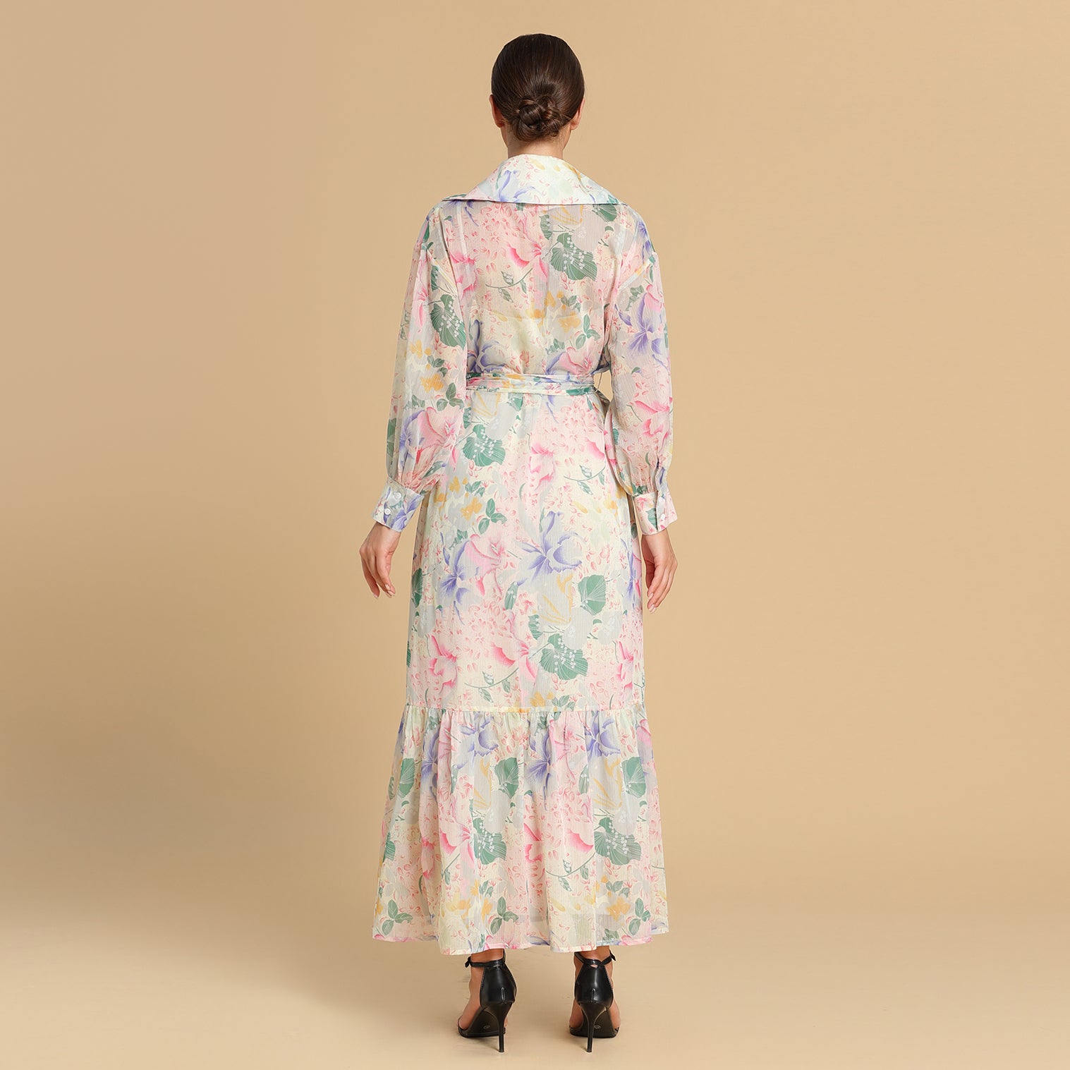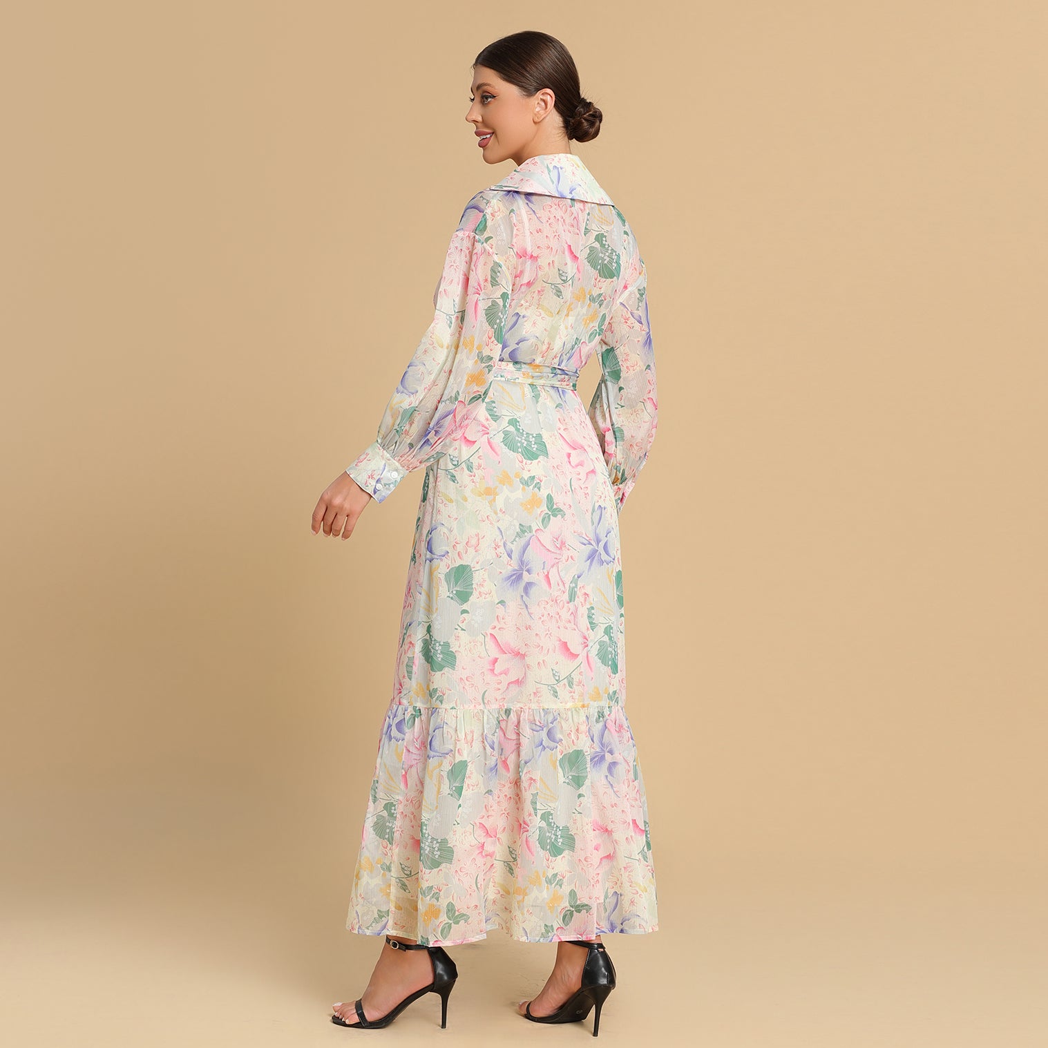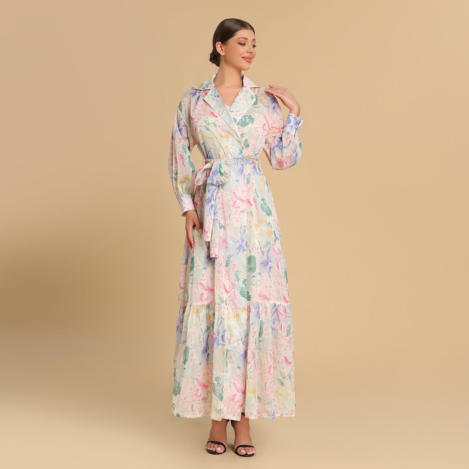 ‎فستان ينبض بأنوثة رقيقة، بنقشات زهرية بألوان الباستيل الهادئة تضفي لمسة فنية حالمة. يتميّز بقصّة لف بحزام من نفس القماش وتفاصيل كشكش انسيابية عند الحافة السفلية. مثالي لإطلالة صباحية ناعمة أو لمناسبات الربيع الأنيقة