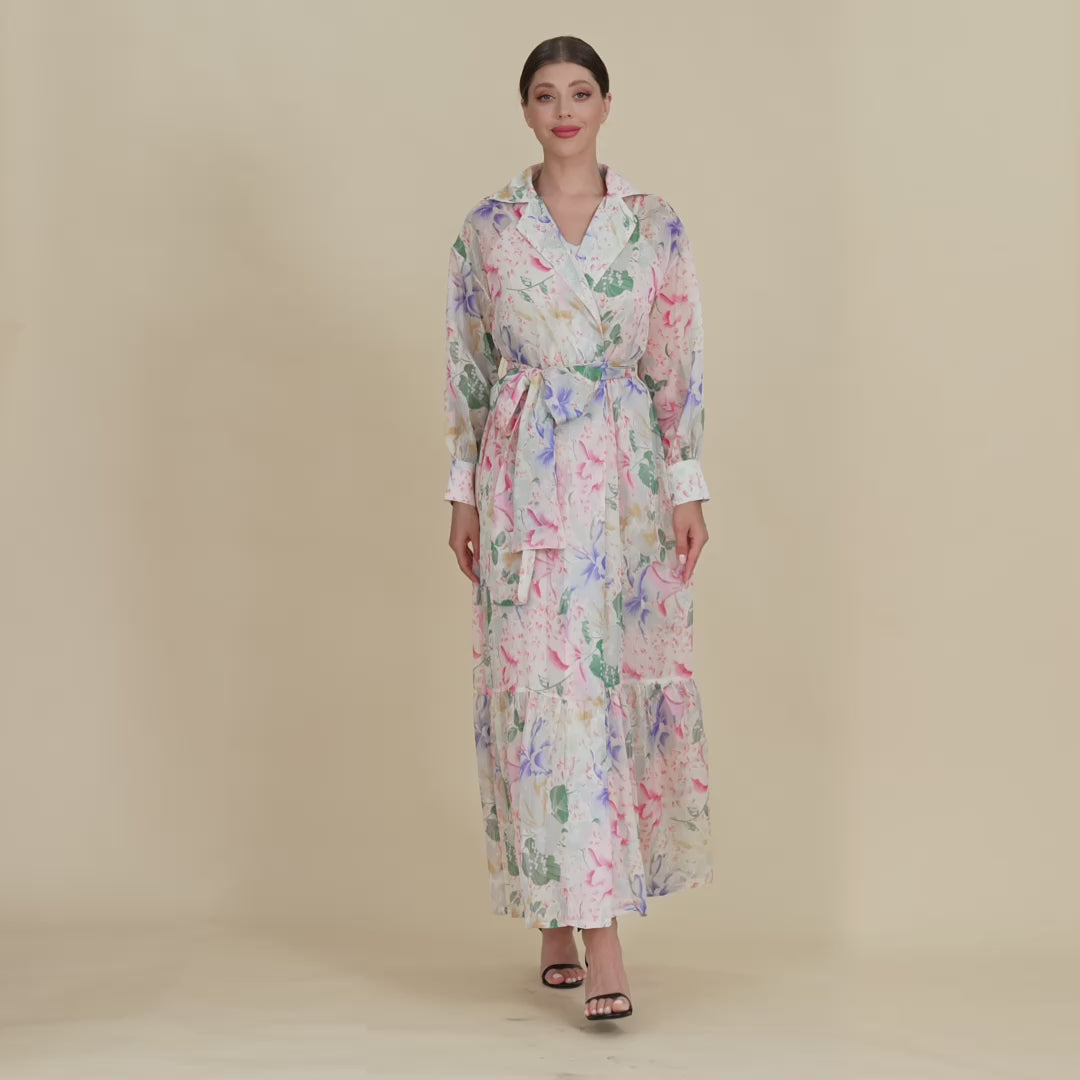 فستان ينبض بأنوثة رقيقة، بنقشات زهرية بألوان الباستيل الهادئة تضفي لمسة فنية حالمة. يتميّز بقصّة لف بحزام من نفس القماش وتفاصيل كشكش انسيابية عند الحافة السفلية. مثالي لإطلالة صباحية ناعمة أو لمناسبات الربيع الأنيقة