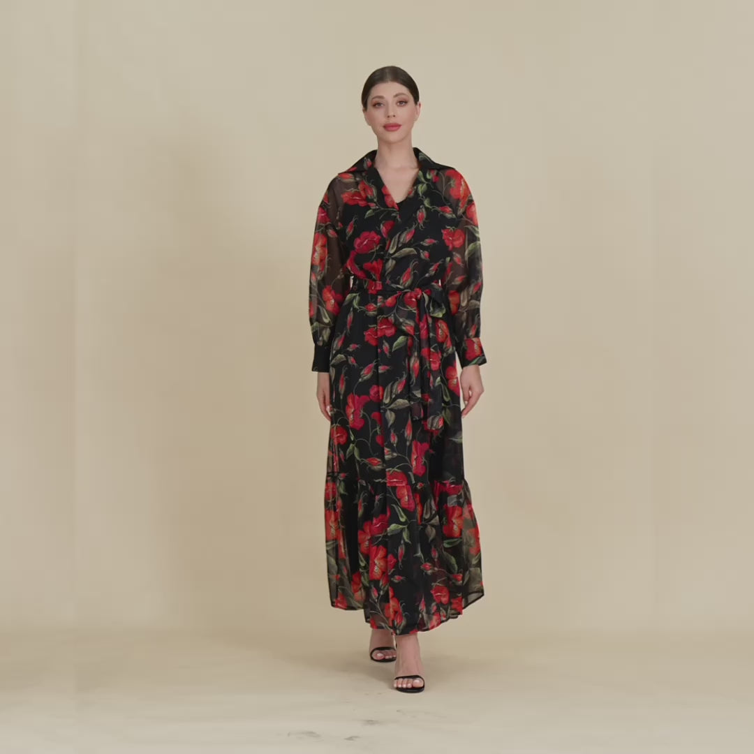 A timeless wrap dress reimagined in sheer printed chiffon. The deep floral tones bloom beautifully against a dark backdrop, while the belted waist and tiered hem evoke refined femininity. A statement of poise and allure — perfect from day to evening.