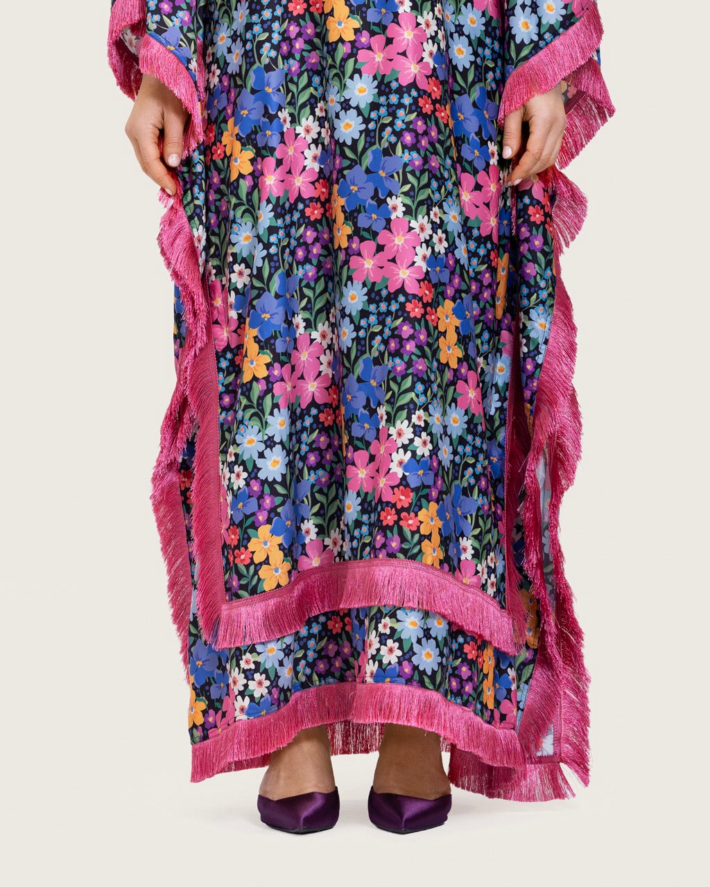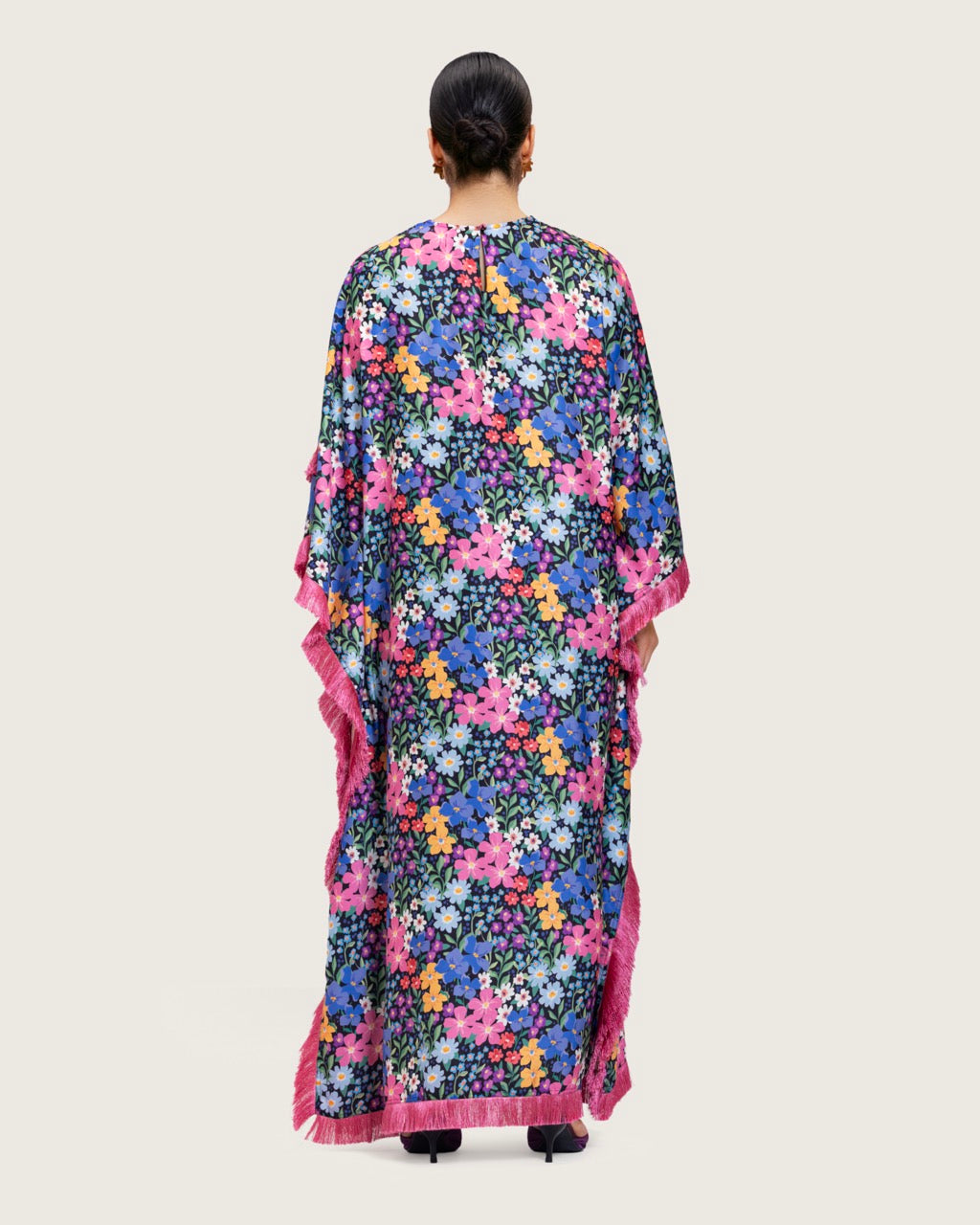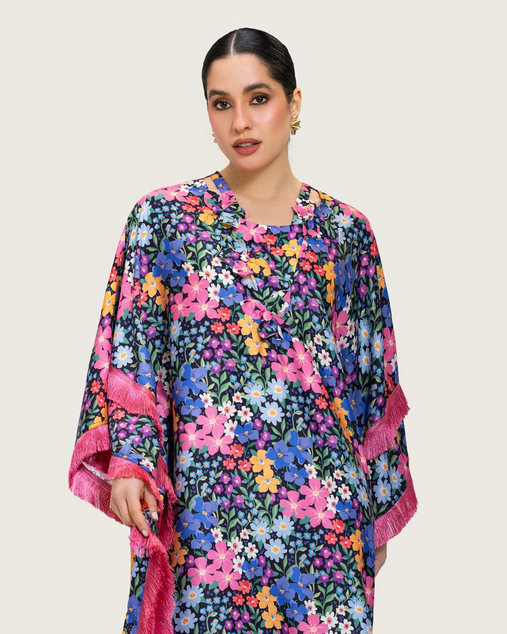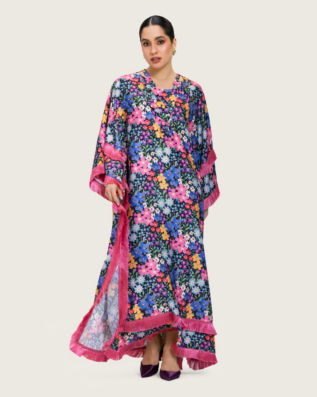 A printed satin dress that blends softness with statement elegance. Crafted from smooth satin with fringes, it features a flowing maxi length and a relaxed silhouette that flatters effortlessly. Designed with delicate fringes that add movement and standout 3D floral details for a refined, artistic touch. Lightweight to medium in weight, it’s perfect for evening gatherings, special occasions, or resort wear. Style it with heels for a polished look.