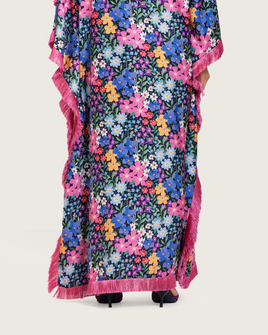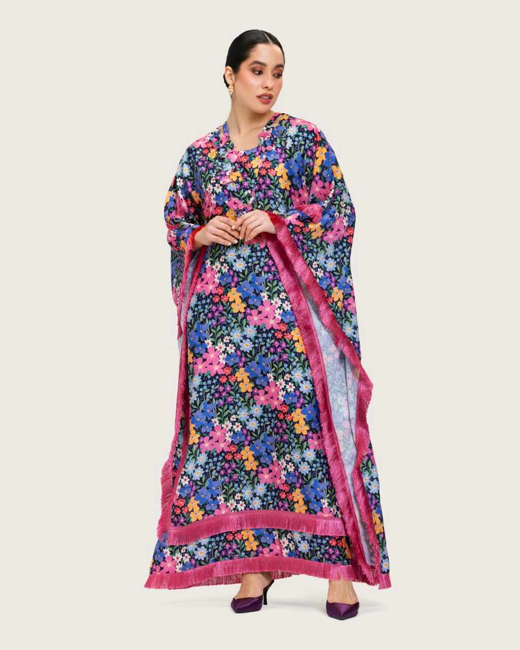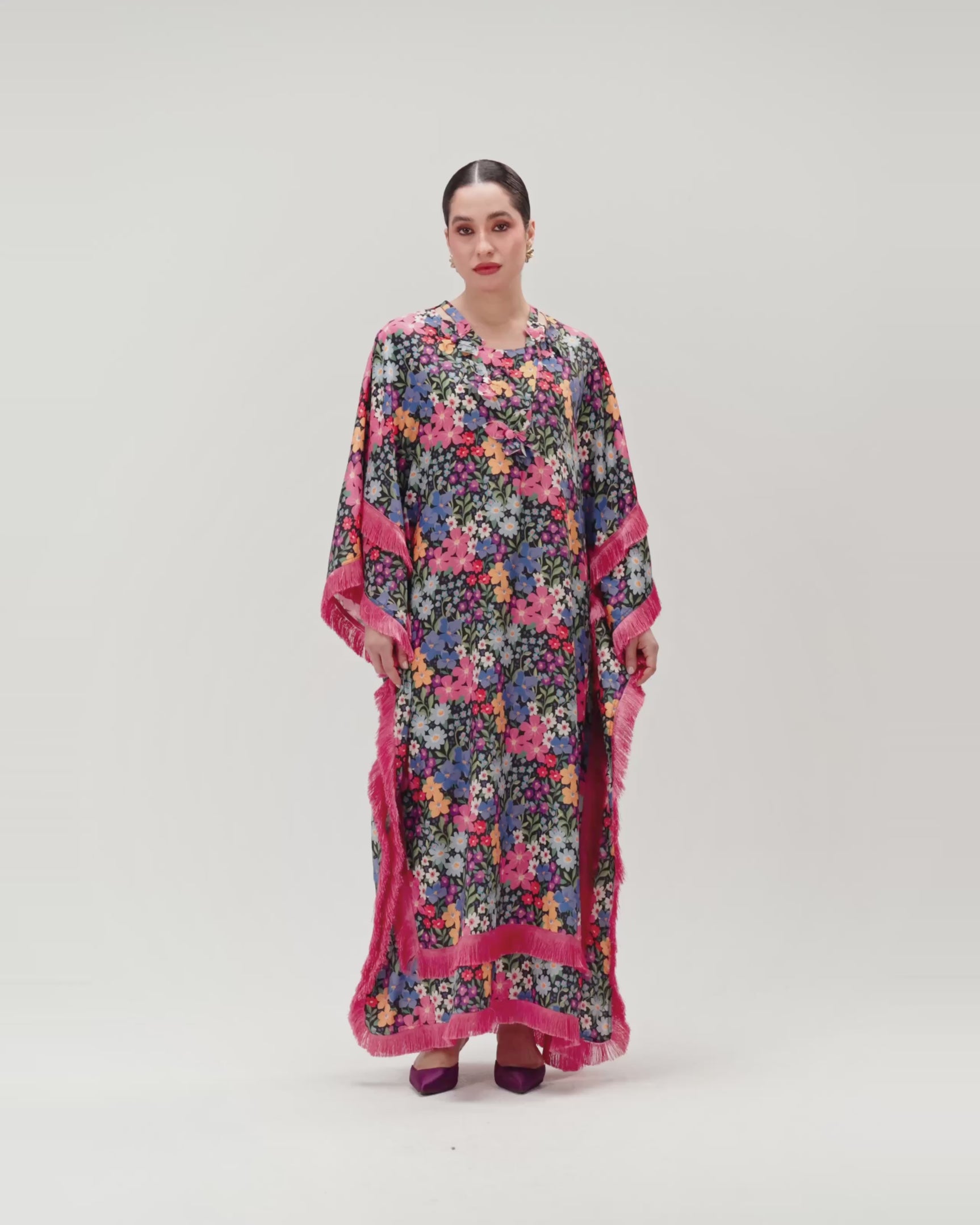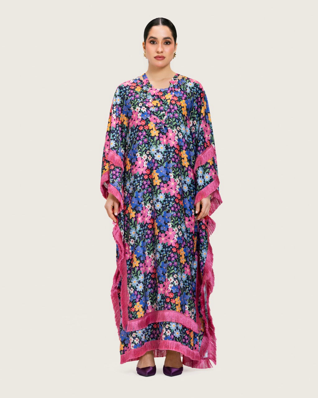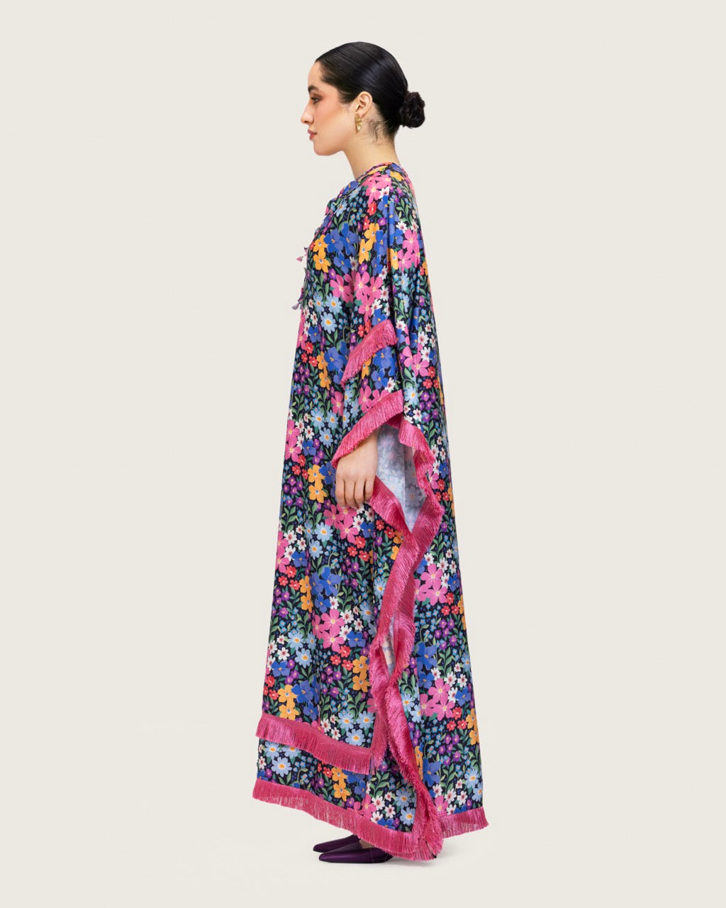 A printed satin dress that blends softness with statement elegance. Crafted from smooth satin with fringes, it features a flowing maxi length and a relaxed silhouette that flatters effortlessly. Designed with delicate fringes that add movement and standout 3D floral details for a refined, artistic touch. Lightweight to medium in weight, it’s perfect for evening gatherings, special occasions, or resort wear. Style it with heels for a polished look.