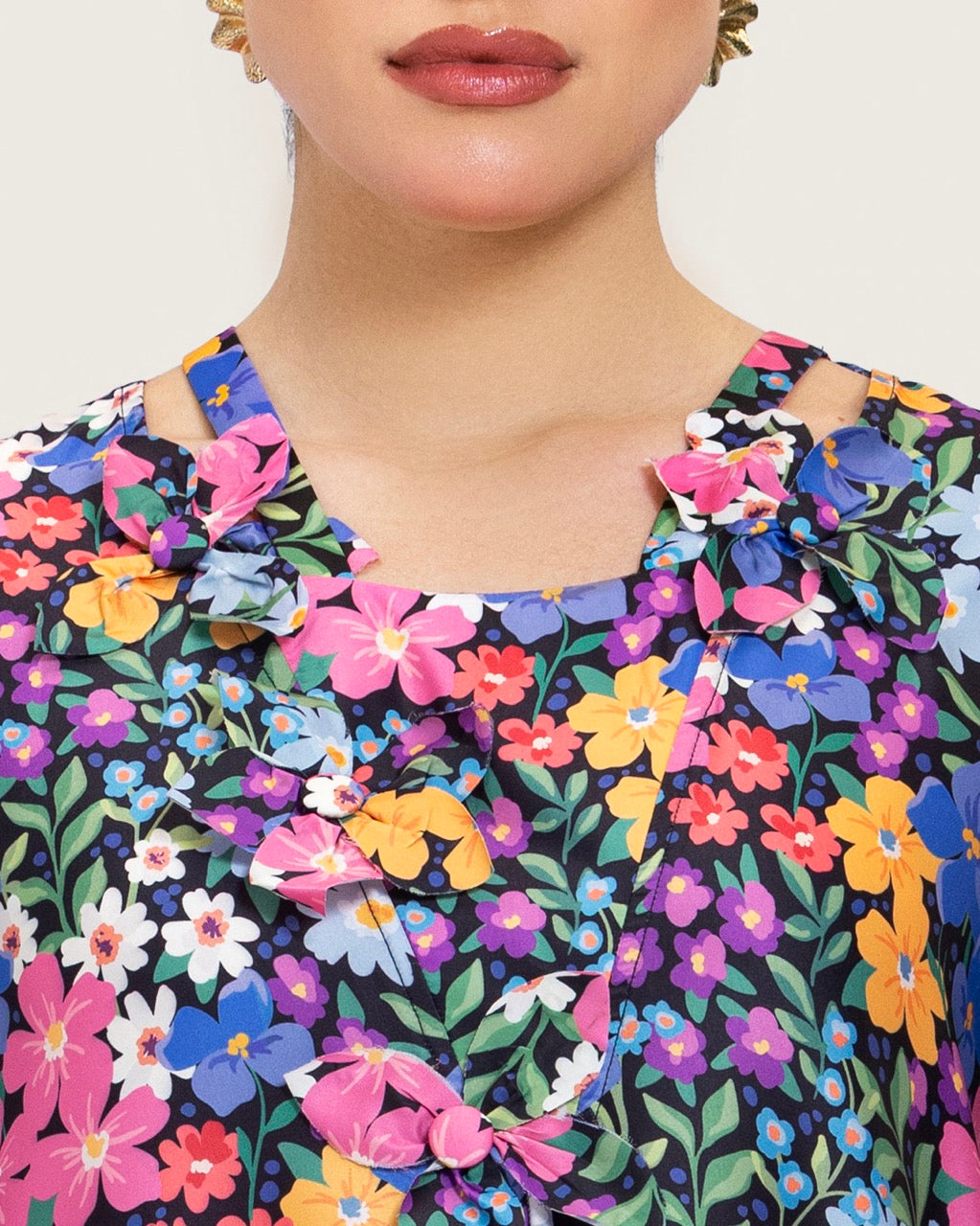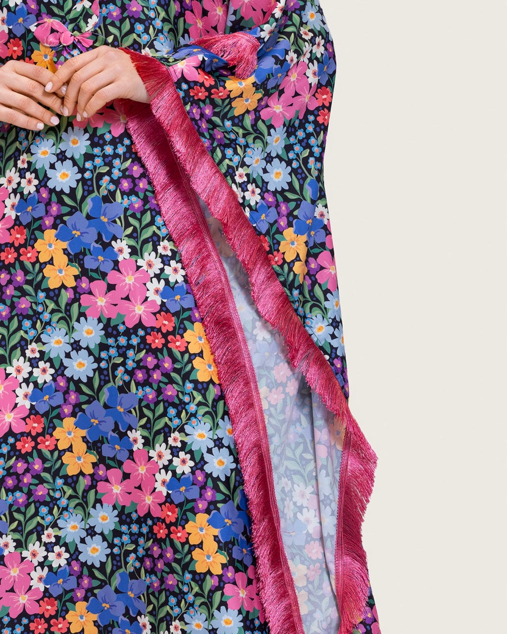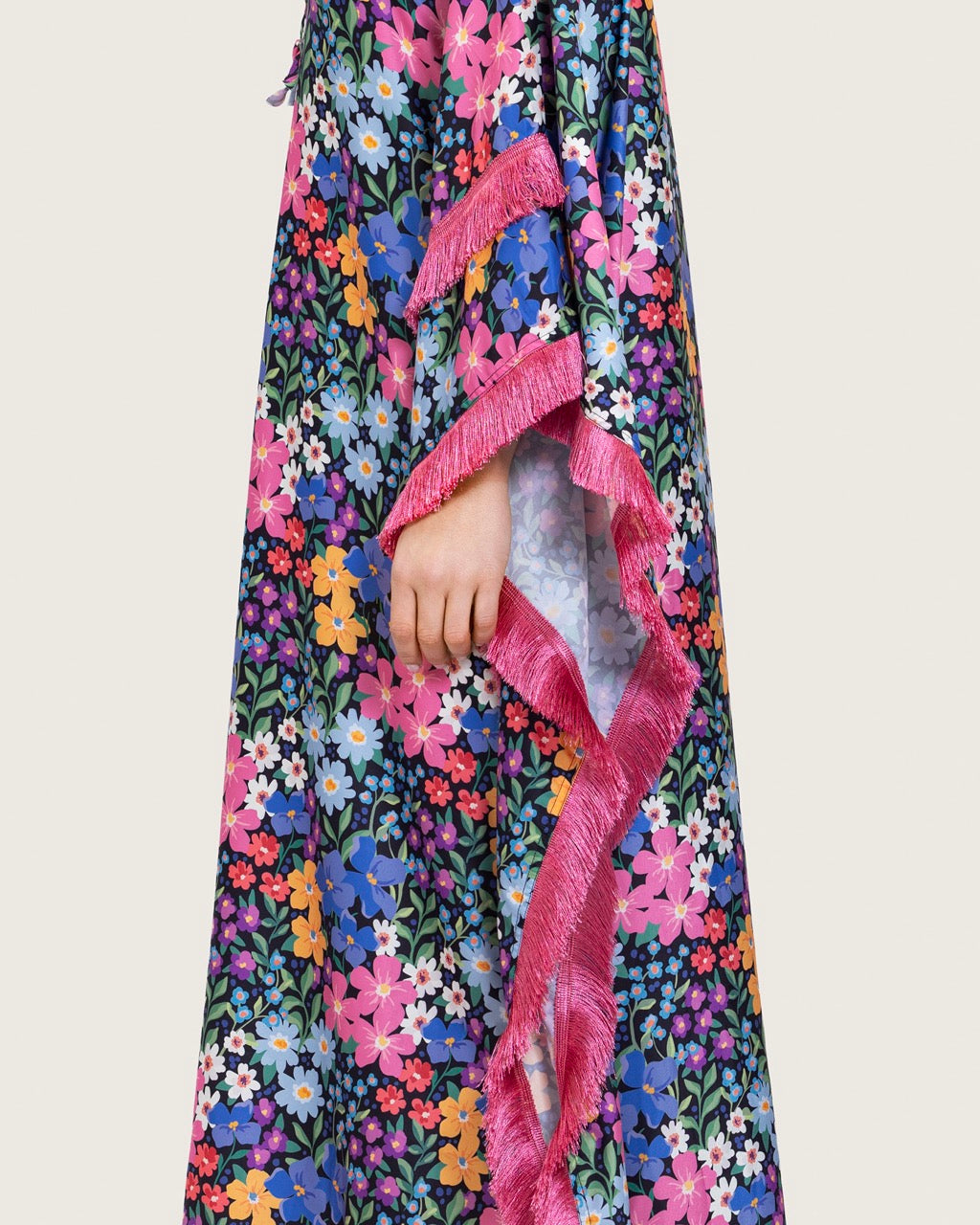 فستان ستان ملون مطبوع بأهداب وتفاصيل ورود ثلاثية الأبعاد