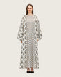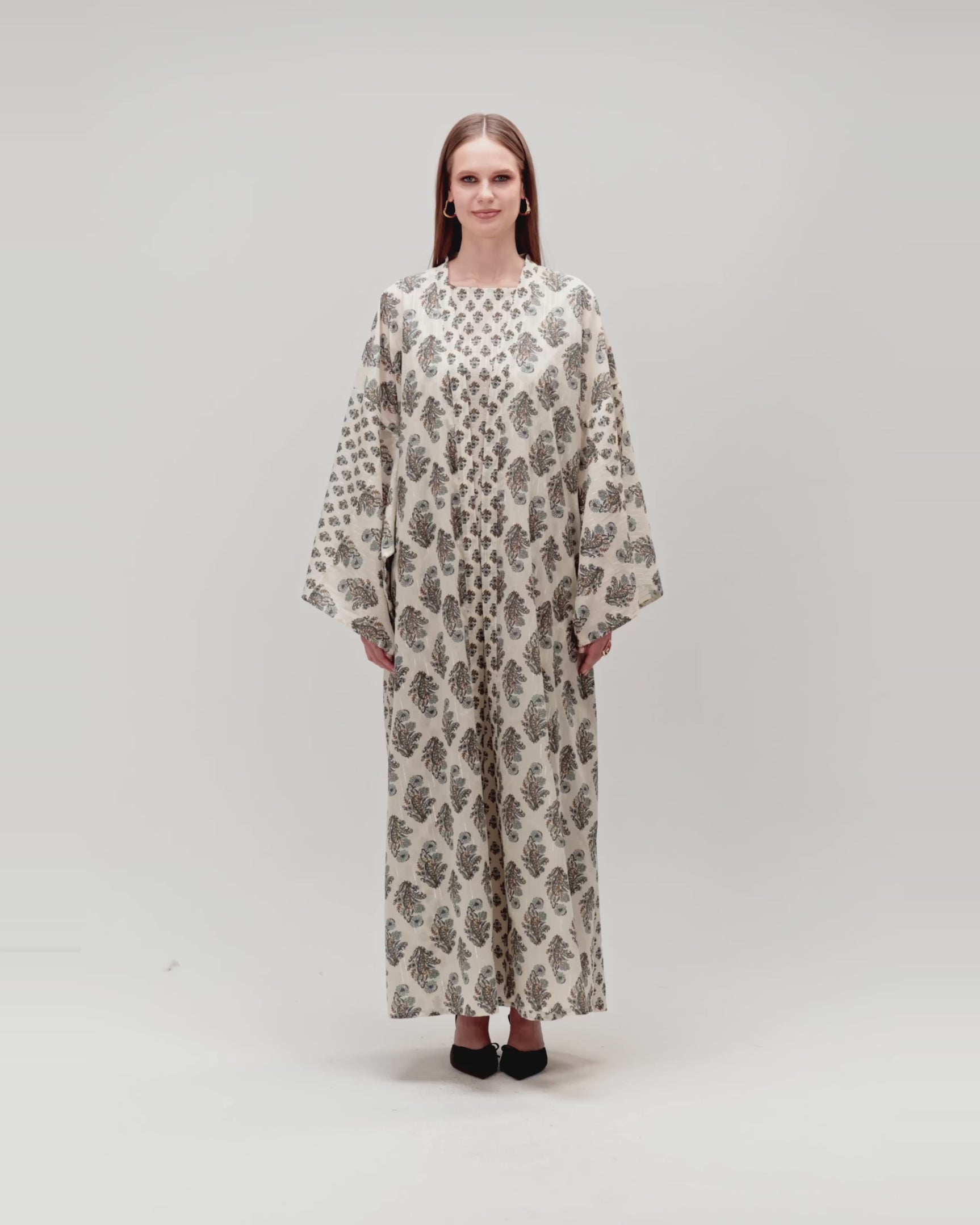 A maxi kimono abaya dress set featuring an inner dress and a flowing outer abaya, crafted from lightweight cotton fabric and metalic threads. Designed with a relaxed straight silhouette and full length, perfect for daytime outings and Ramadan occasions. Style with flats for a casual look or heels for elevated elegance.