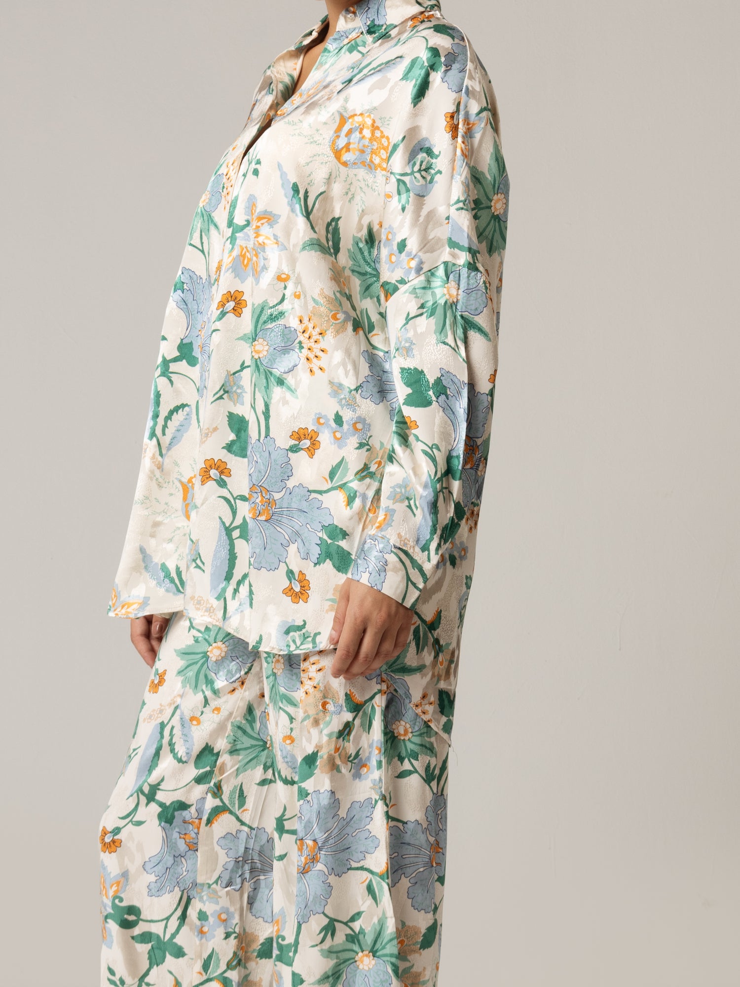 بنطال طويل وواسع مصنوع من الساتان مشجَر