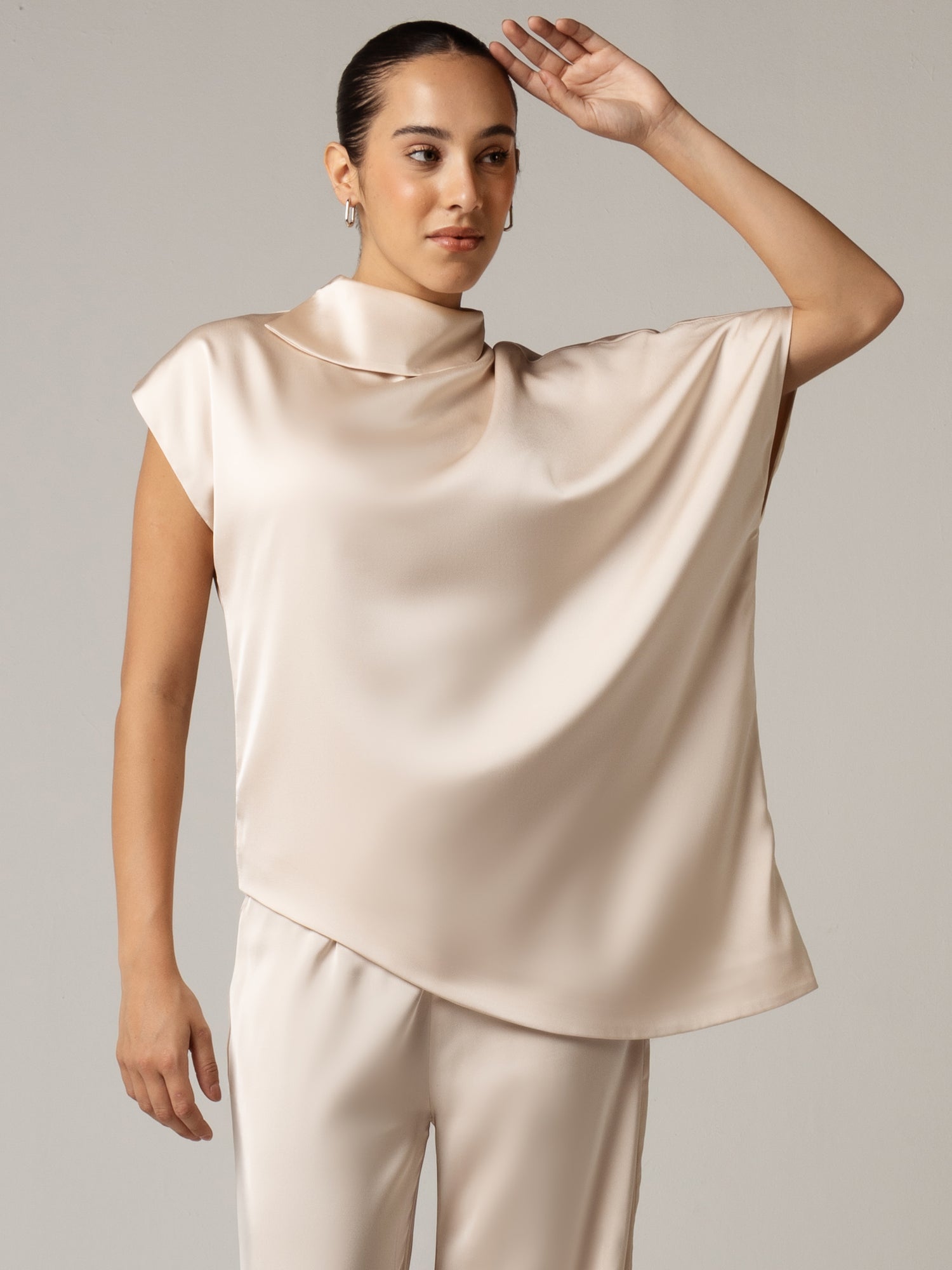 طقم راقي مصنوع من الساتان المسدول ، بلوزة بقصة حائرة ورقبة مرتفعه ، مع بنطال واسع طويل ، خيار مثالي للمناسبات والإطلالات الراقيه .