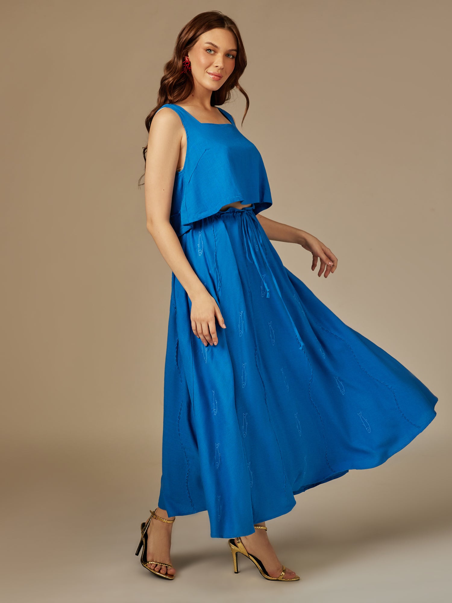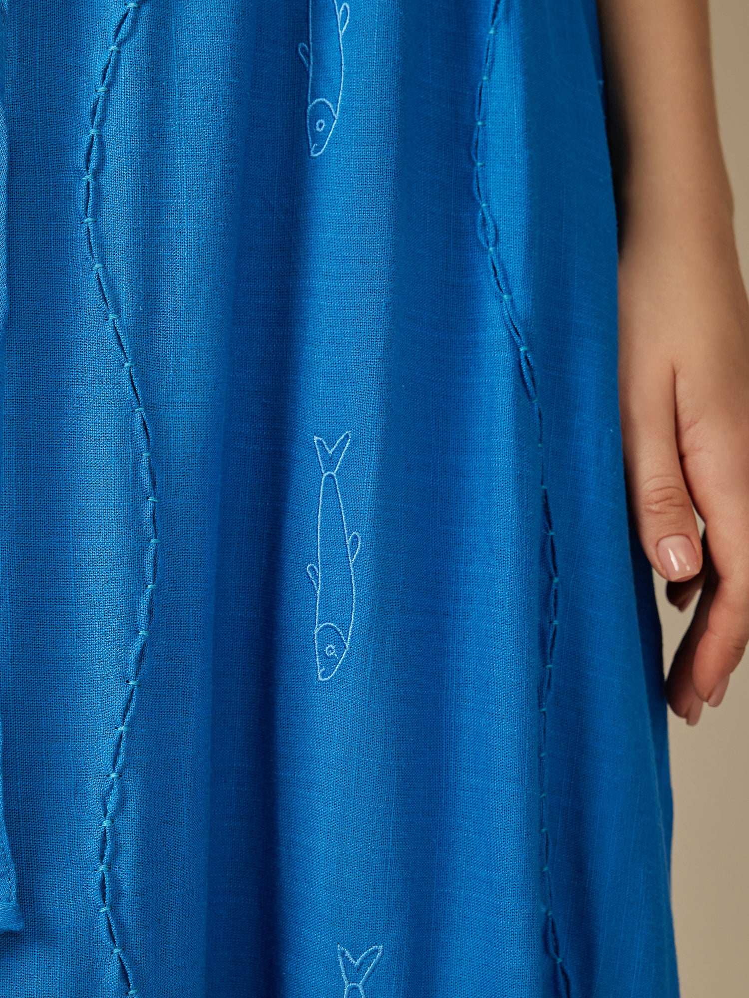 A two-piece ode to simplicity and sea life, this linen set dances with hand-embroidered najel fish swimming subtly across its hand tucked flowy lines. The crop top features soft raw-edged finishes and delicate buttons down the back, while the skirt cinches with a tasseled tie. Lightweight, breathable, and full of character, it’s an effortless choice for sunlit escapes by the water.