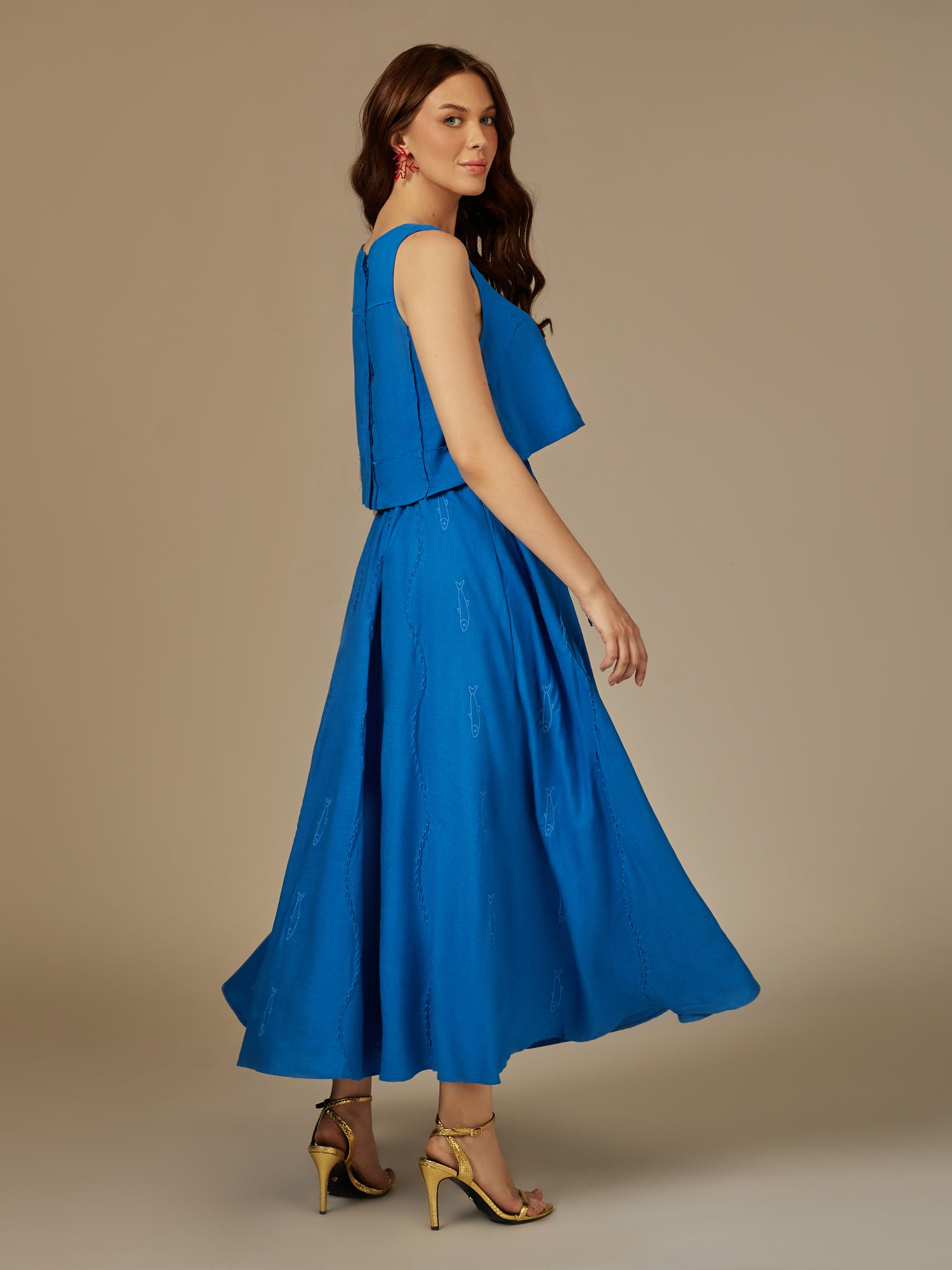 طقم ازرق بلوزة و تنورة مزينة بتموجات و تطريز سمك