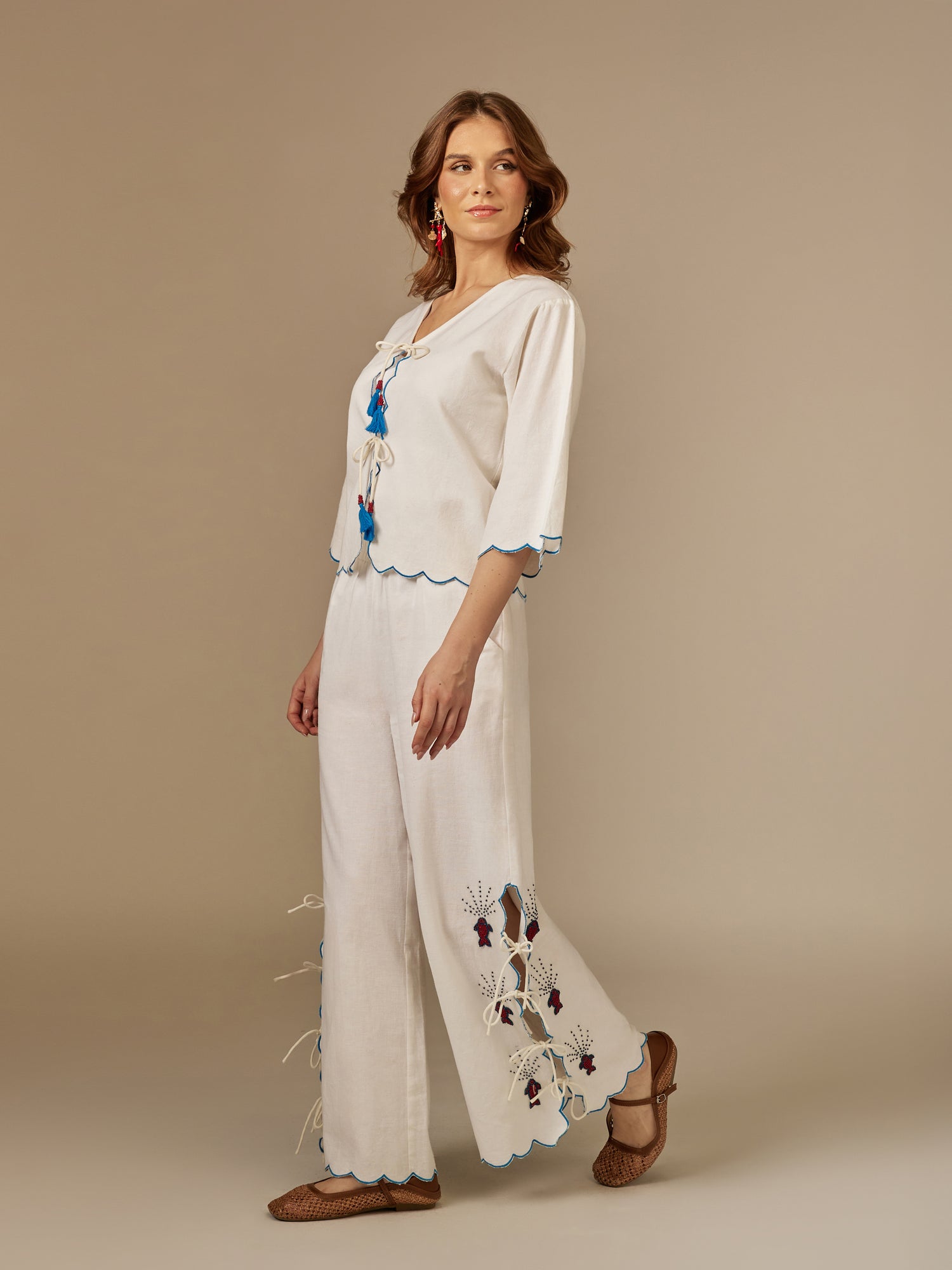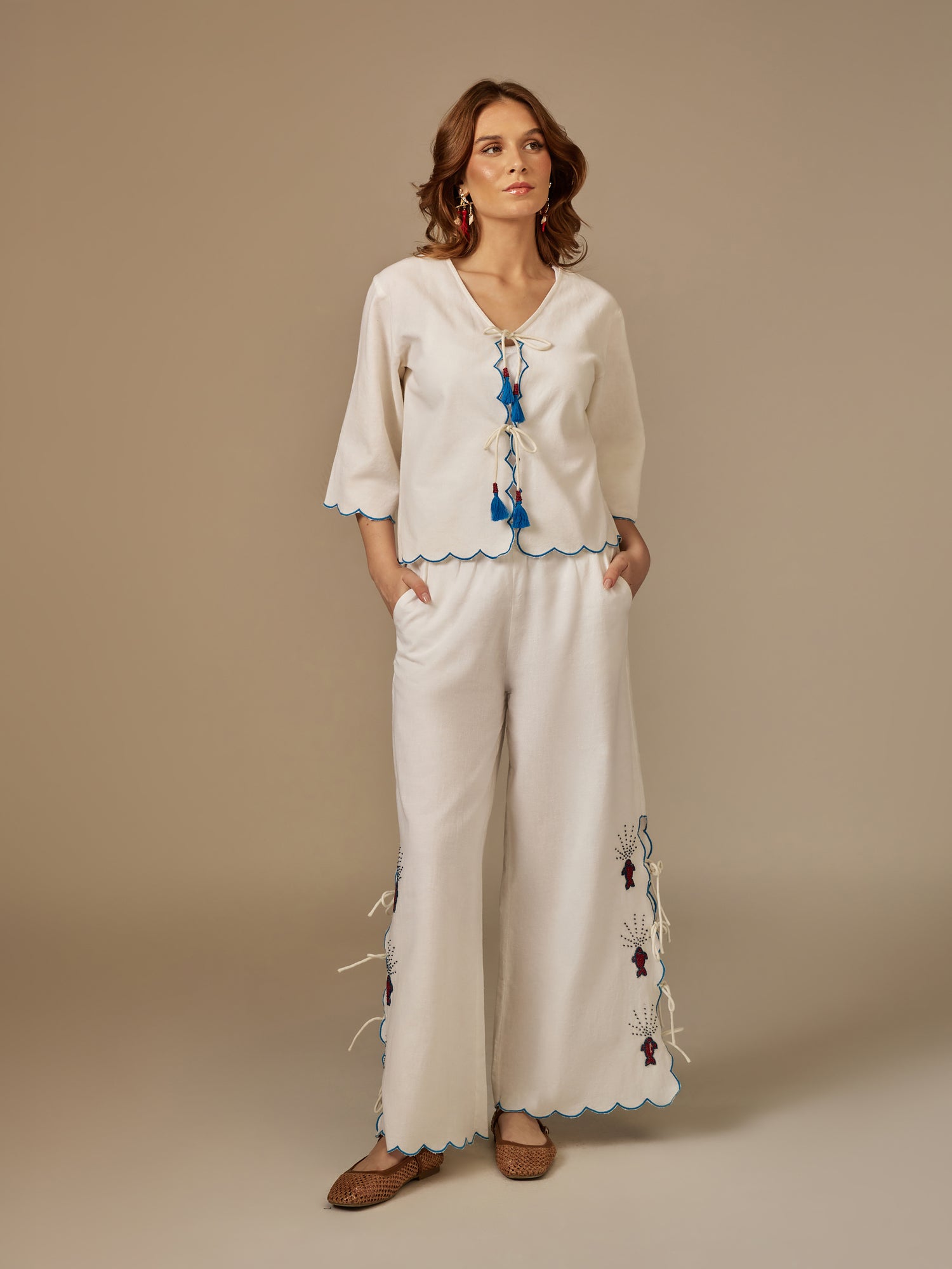 يُبرز هذا الطقم أناقة التفاصيل البسيطة التي تمنح الإطلالة طابعاً عصرياً وناعماً. يتميز بتطريزات يدوية على شكل اسماك تضيف لمسة فنية لافتة، مع أطراف مموجة مزينة بخيوط زرقاء تمنح القطعة بعداً أنثوياً أنيقاً. يأتي التوب بأكمام واسعة وأربطة أمامية مزينة بشراشيب ملونة، بينما يكتمل البنطال بأربطة جانبية وتطريزات ناعمة تعزز من حيوية الإطلالة. مثالي للأيام الصيفية لإطلالة مريحة ومتجددة