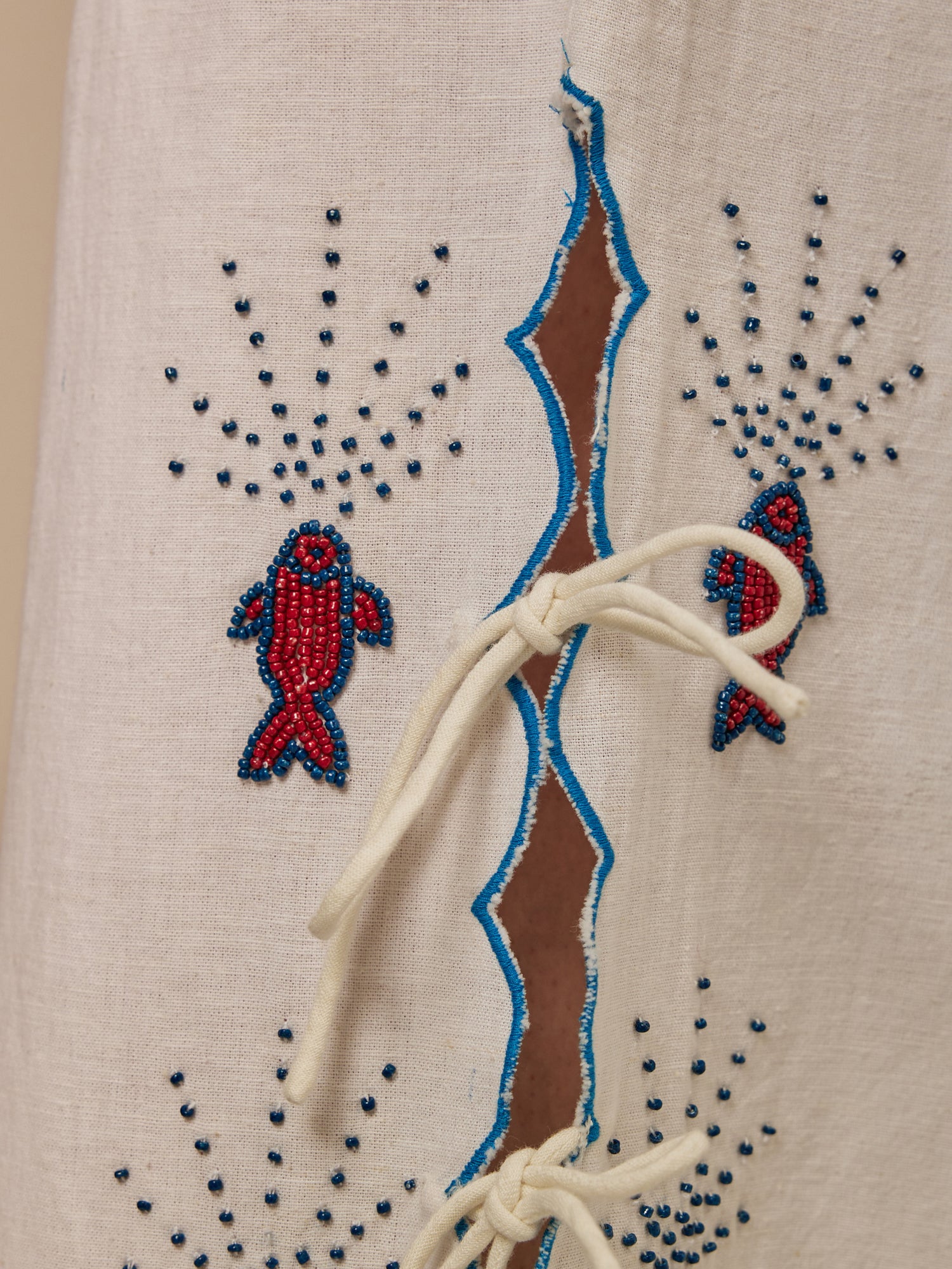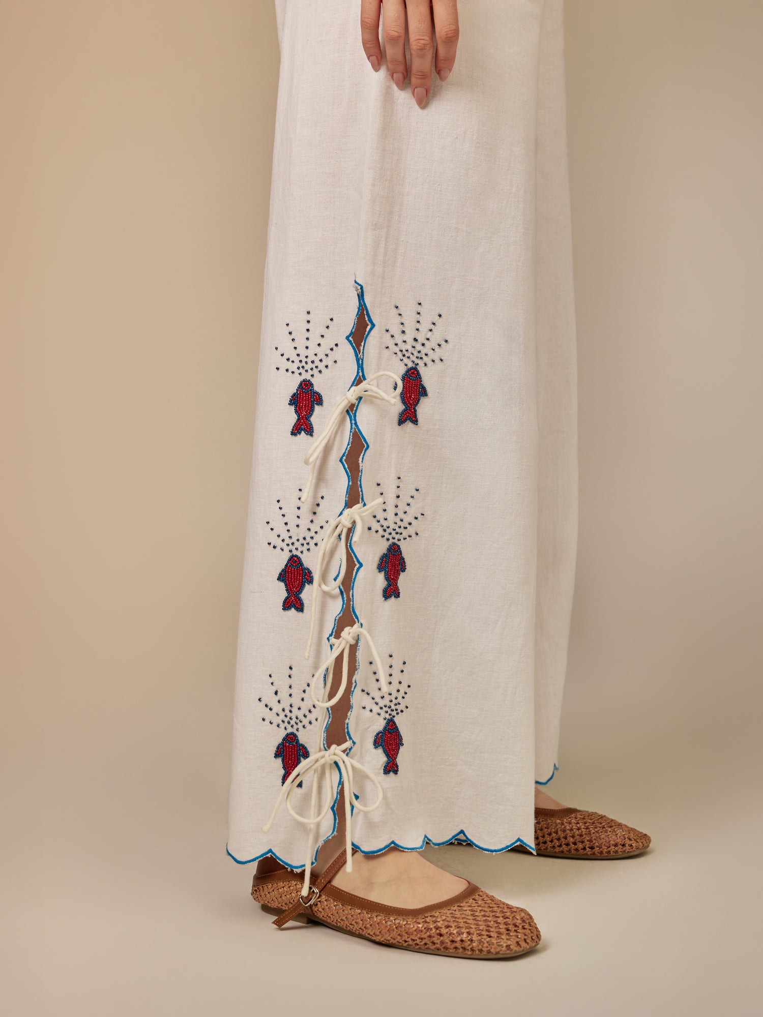 The perfect summer set. The intricate beadwork, featuring vibrant fish motifs, adds a touch of whimsy to the natural fabric, celebrating craftsmanship and creativity. The gentle scalloped edges and playful tassels enhance the overall fluidity of the design. Each piece tells a story of artistry and individuality, inviting the wearer to express their unique style with elegance and charm.