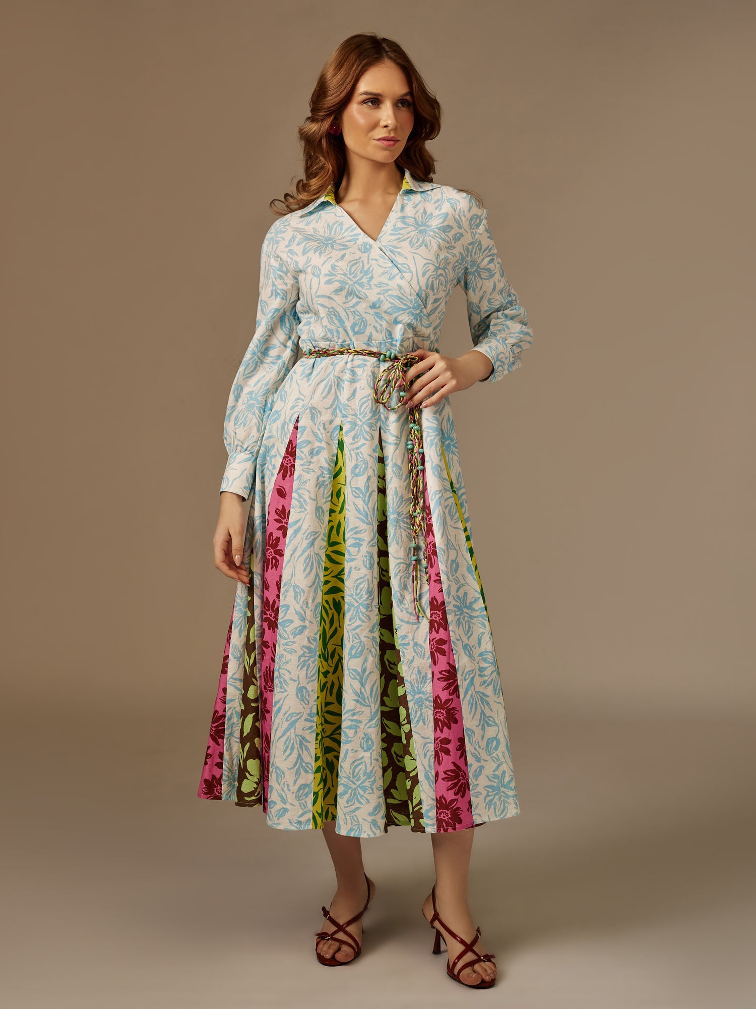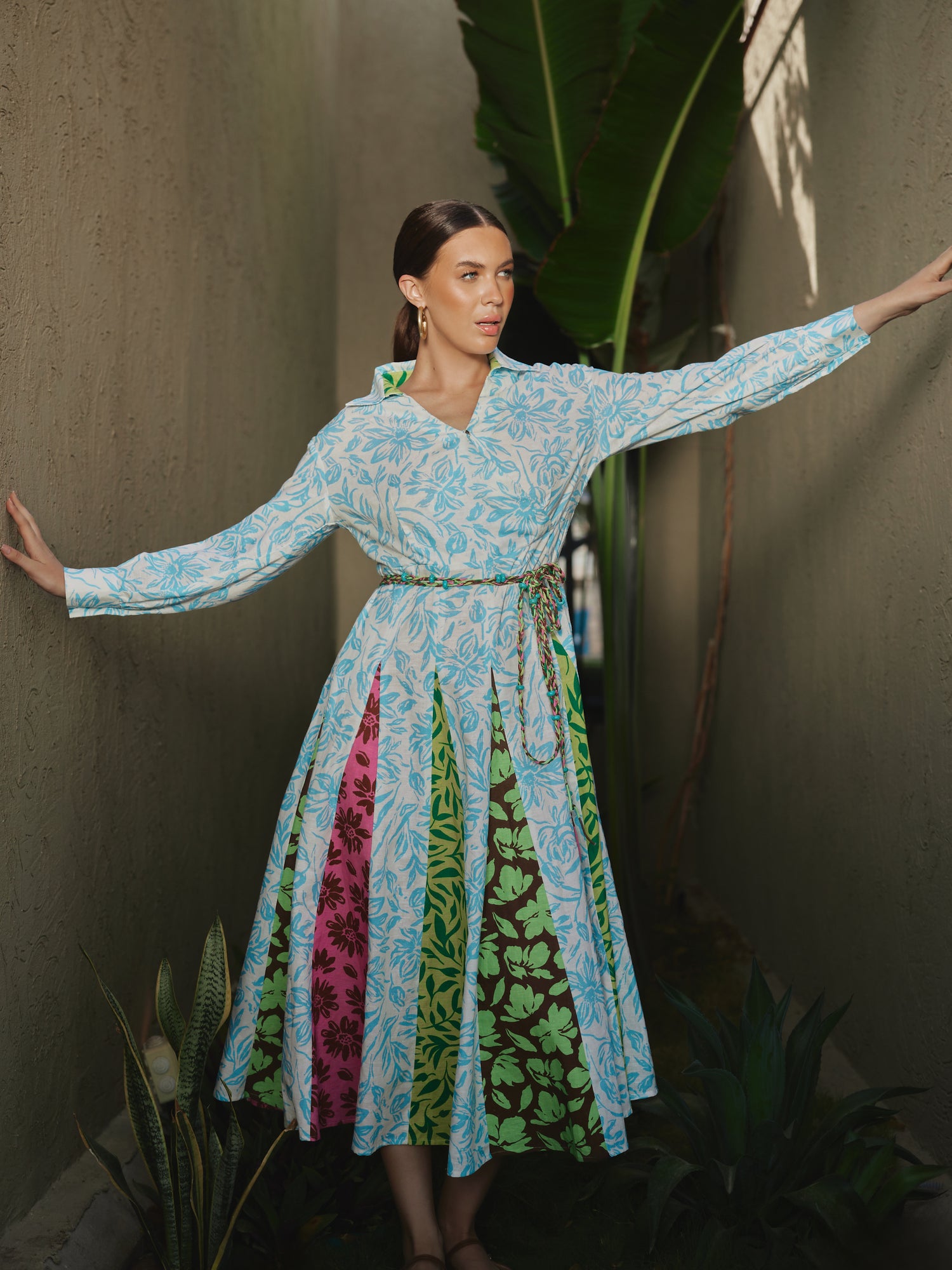 This vibrant linen dress features a playful mix of colors and patterns. The flowing silhouette is accentuated by unique paneling, showcasing an array of botanical designs that celebrate nature's beauty. The breathable linen fabric ensures comfort and elegance, making it perfect for warm days and outdoor gatherings. The accompanying braided beaded belt adds an extra touch of whimsy.