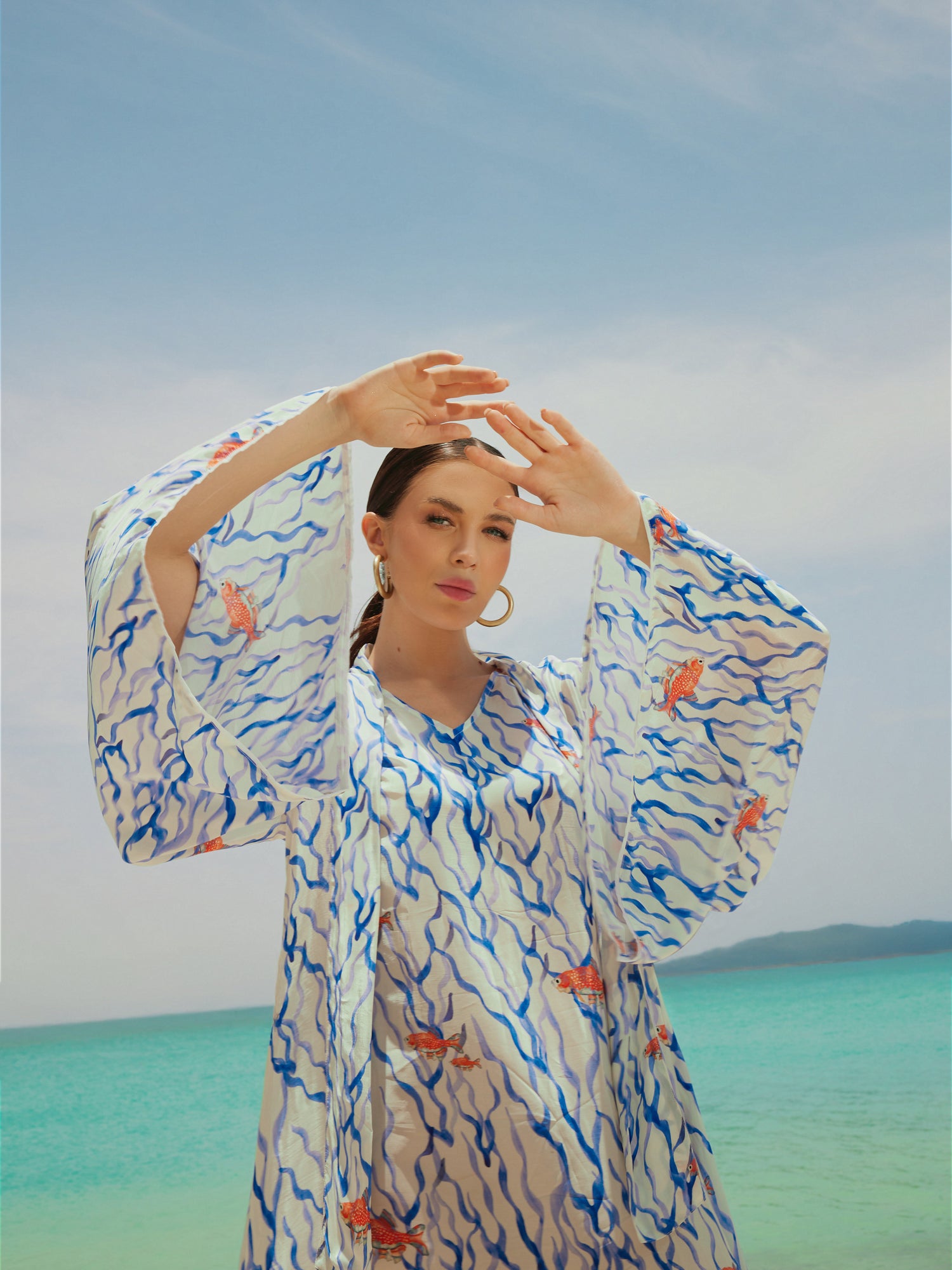 This flowy, lightweight kaftan coverup is a celebration of seasidel charm, featuring delightful Najel fish motifs that evoke a sense of serenity and joy. Crafted from airy fabric, it drapes beautifully, making it the perfect companion for sunny days by the beach or poolside lounging. With its generous cut and elegant bell sleeves, this kaftan is not just a coverup; it’s a statement piece that exudes both comfort and sophistication.