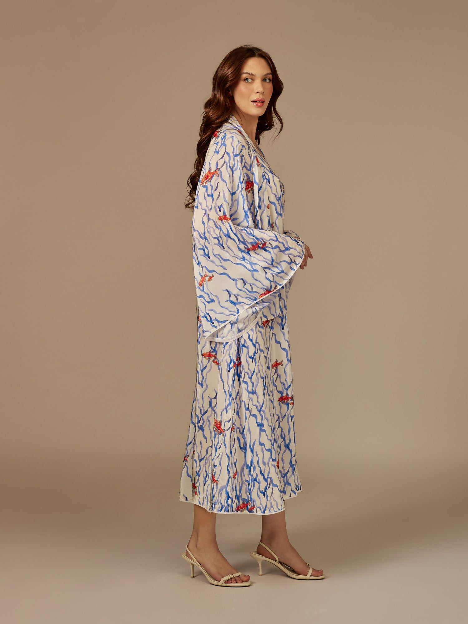 قفطان ابيض وازرق بطبعة مرجان وأكمام واسعة