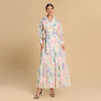 Soft, romantic, and effortlessly refined — this printed chiffon dress features a painterly floral pattern in pastel tones. The wrap silhouette with a self-tie belt flatters the figure, while the ruffled hem adds graceful movement. Perfect for serene daytime gatherings and spring occasions.