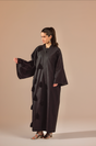 A Luxe Black Linen Abaya Kimono, an embodiment of modern elegance. The piece showcases seamless all-tonal black look, perfect for making a bold yet refined statement. The delicaye beaded black-on-black tassels on one side add a touch of detail while maintaining the minimalist aesthetic. Crafted from linenm this kimono drapes beautifully, offering both comfort and style for any outing.