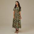 الفستان مصنوع من قماش الكتان، يبرز فيه نقش الأزهار الحيوي على خلفية باللون الأسود، مع لمسات الكروشيه الوردي على الأطراف و حزام يبرز الخصر. يتميز بتفاصيل الأزرار الأمامية والأكمام القصيرة ليكون خيارًا مثاليًا لإطلالة أنيقة.