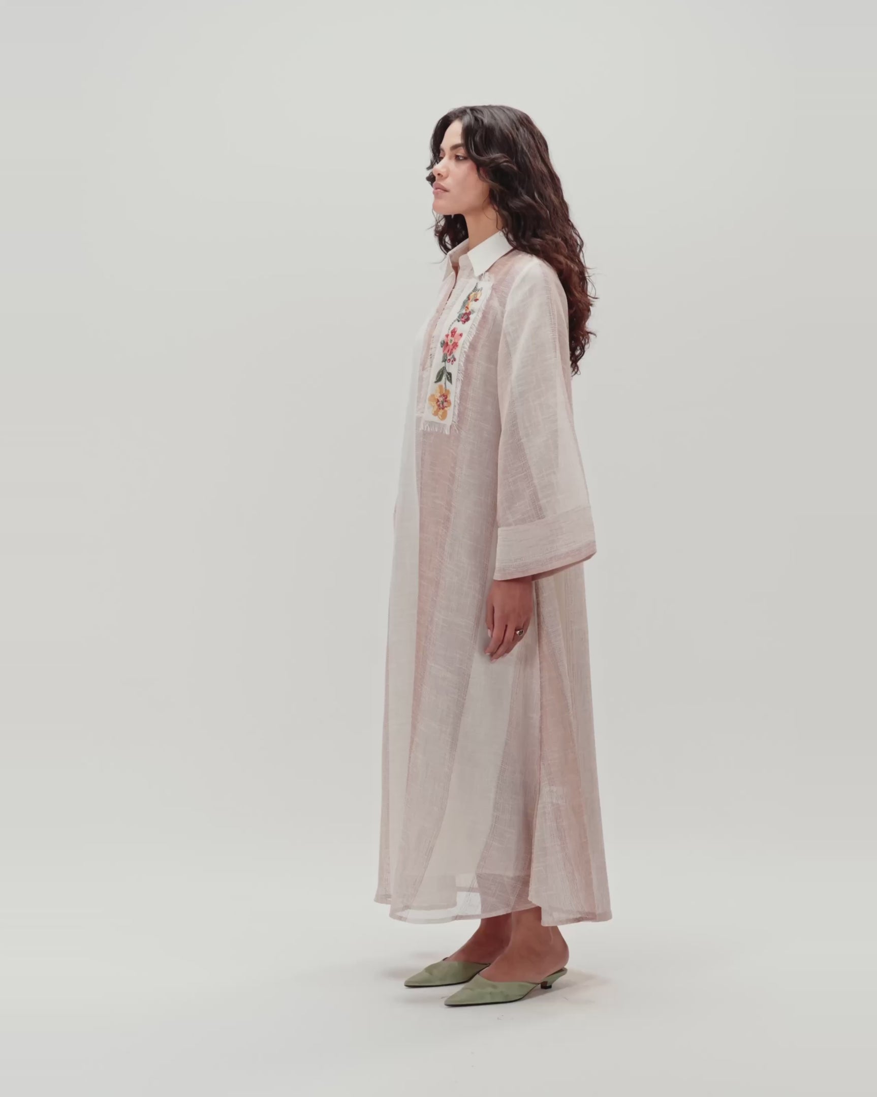 A maxi dress designed to express soft femininity and refined simplicity. Crafted from a lightweight fabric, it offers all-day comfort without heaviness. Featuring a full-length maxi cut, a relaxed straight silhouette, wide sleeves, and a classic collar, the dress is finished with delicate floral embroidery and handmade embellishments that adds an artisanal touch. Light to medium in weight, it is ideal for daytime gatherings, travel, Ramadan occasions, and relaxed events. What sets it apart is its breathable fabric, timeless design, and subtle handcrafted detail. Style with flat sandals for daytime ease or elevate with heels and minimal accessories for an elegant look.