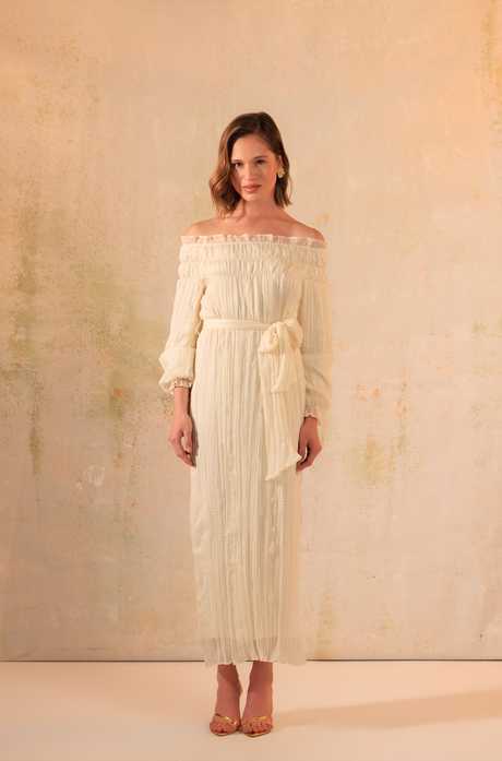 459.00Unit price /Unavailable Cream Off-Shoulder Crinkled Chiffon Dress