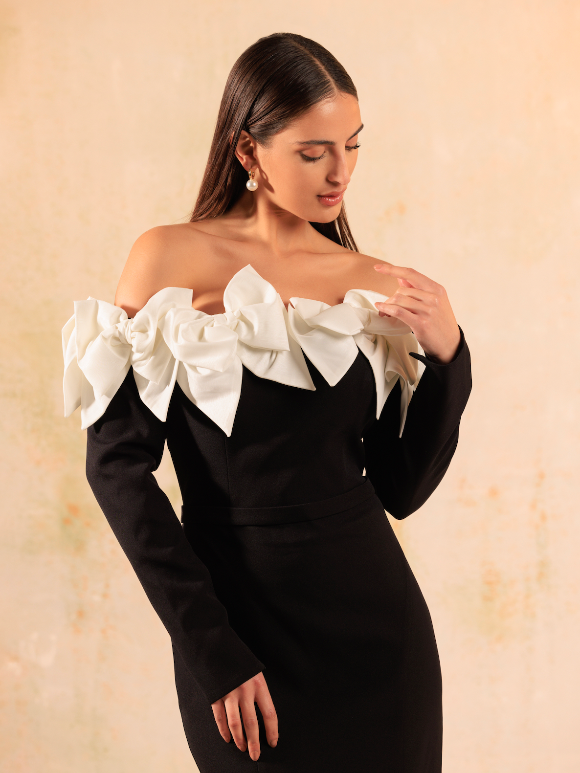 This exquisite ankle-length crepe dress redefines elegance with its off-shoulder design and long sleeves, crafted to enhance the hourglass silhouette. The stunning fish tail hem adds an element of drama, gracefully flowing with every step. Decorated with contrasting taffeta white bows along the shoulder line, this dress beautifully balances sophistication with a playful touch. Perfect for special occasions and dinners.