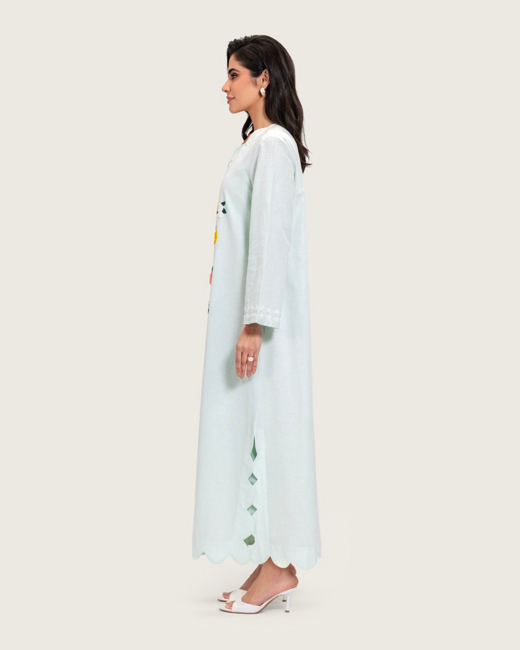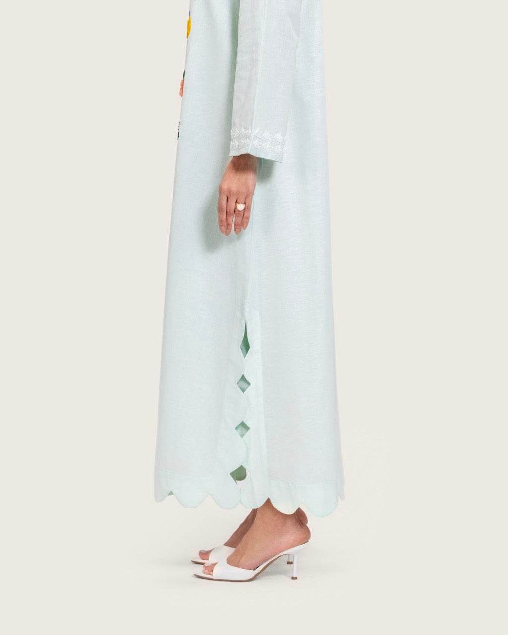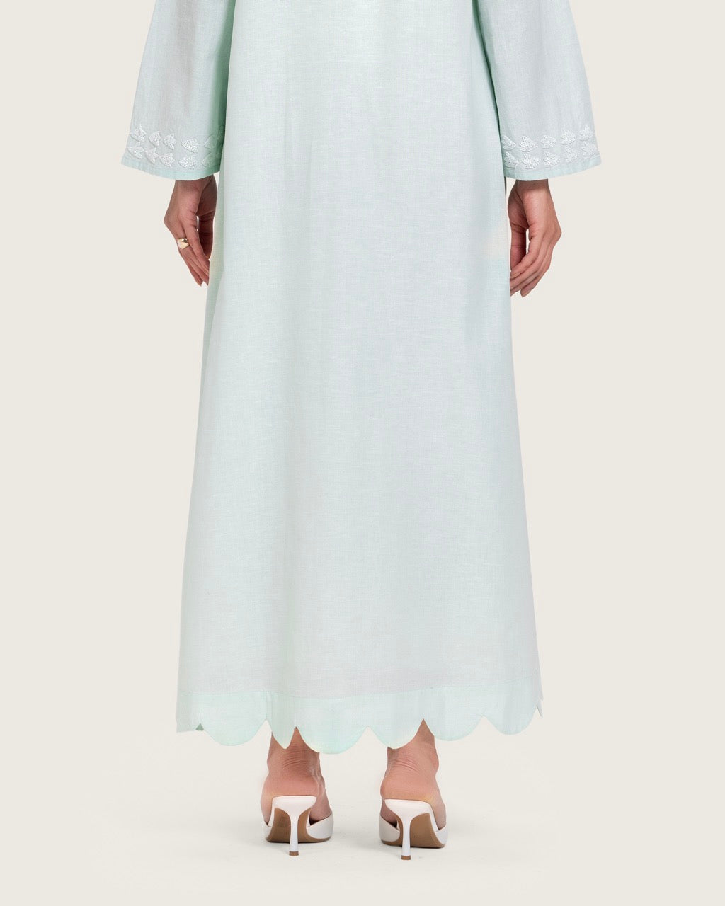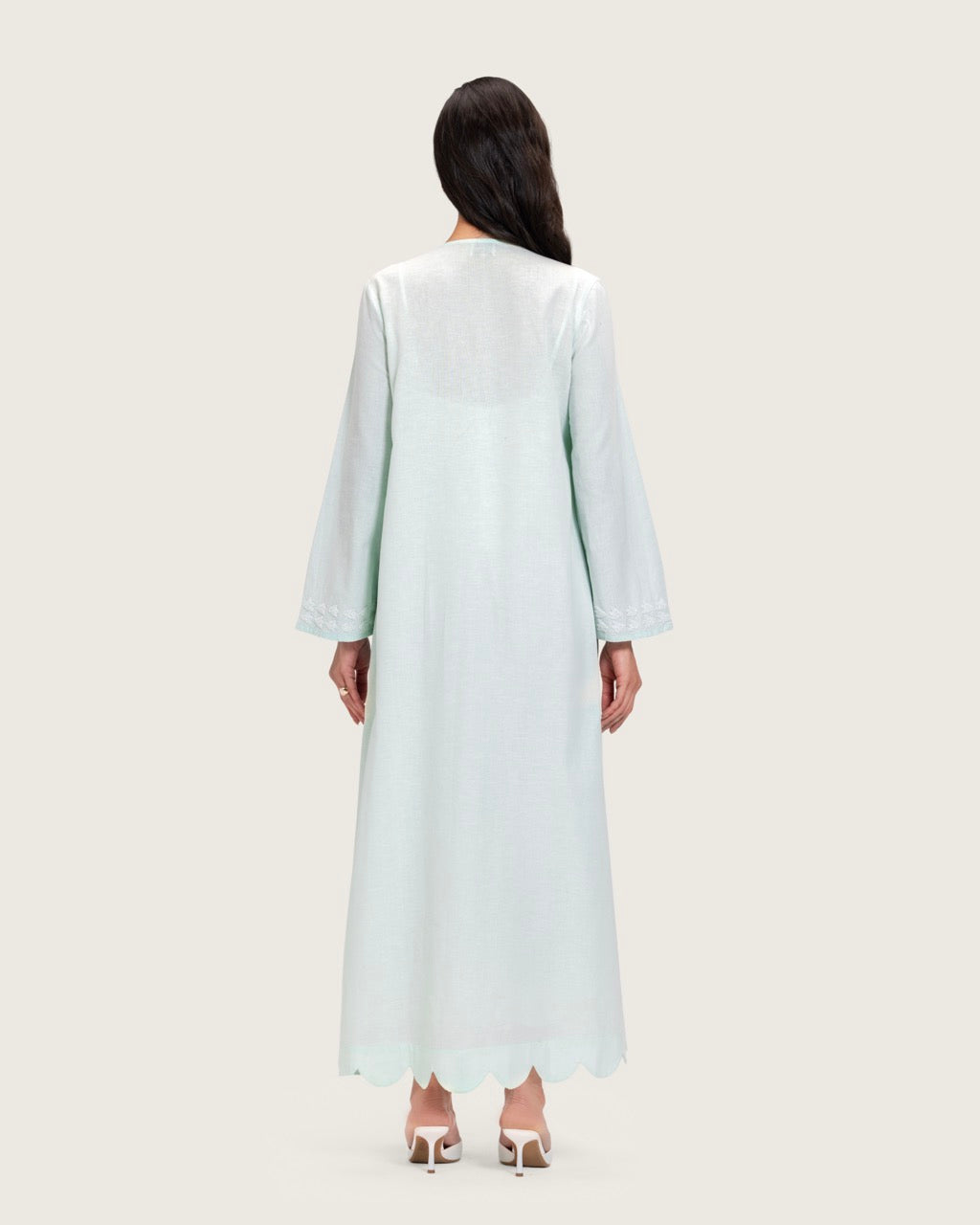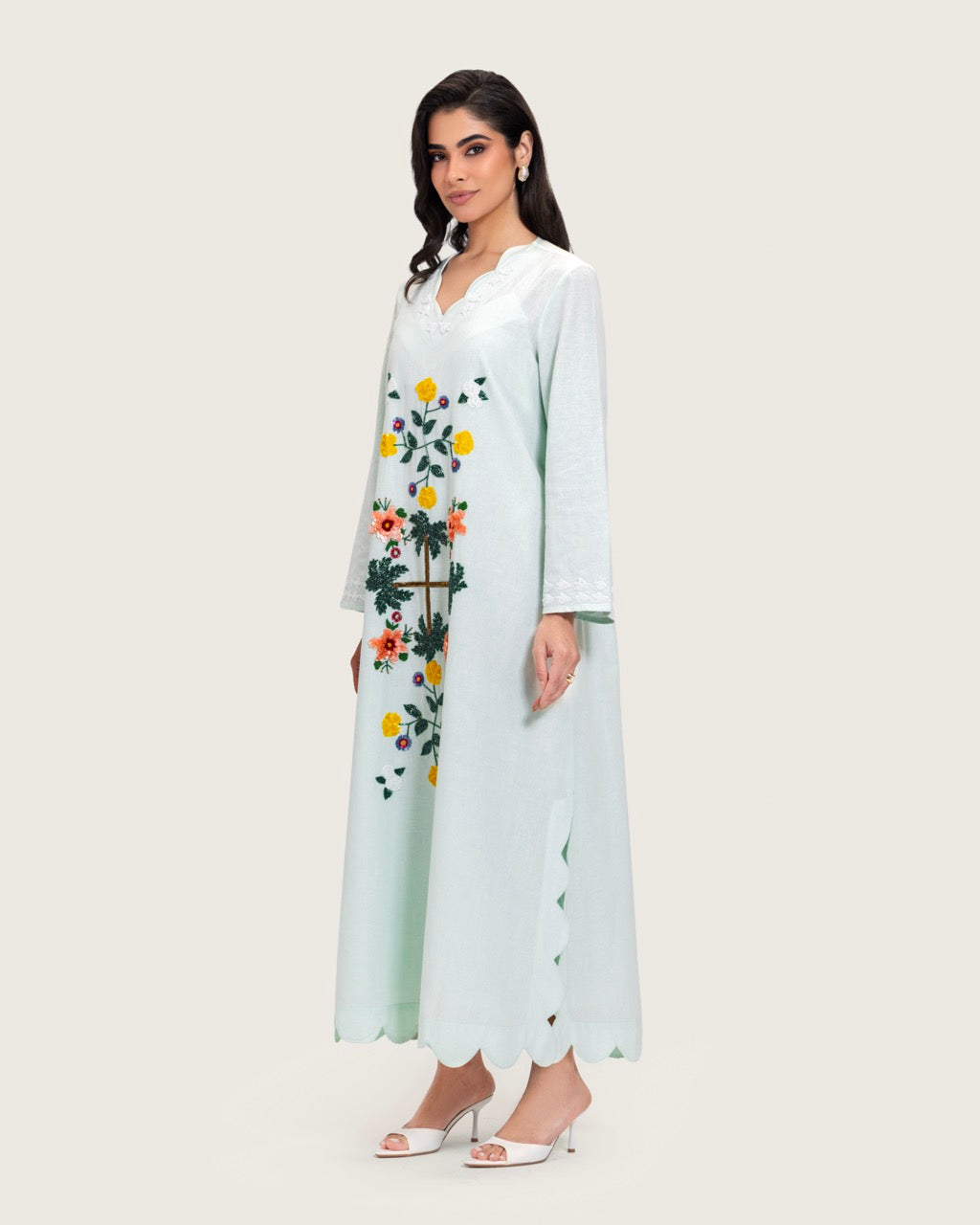A timeless maxi dress designed with understated elegance and artisanal detail. Crafted from breathable linen, it offers lightweight comfort with a soft, airy feel. Featuring a full-length maxi cut, a relaxed straight silhouette, long sleeves, a subtle neckline, and a scalloped hem, the dress is finished with handcrafted floral embroidery that adds a refined artistic touch. Light to medium in weight, it is ideal for daytime gatherings, Ramadan occasions, travel, and relaxed events. Style with flat sandals for an effortless daytime look or elevate with heels and minimal accessories.