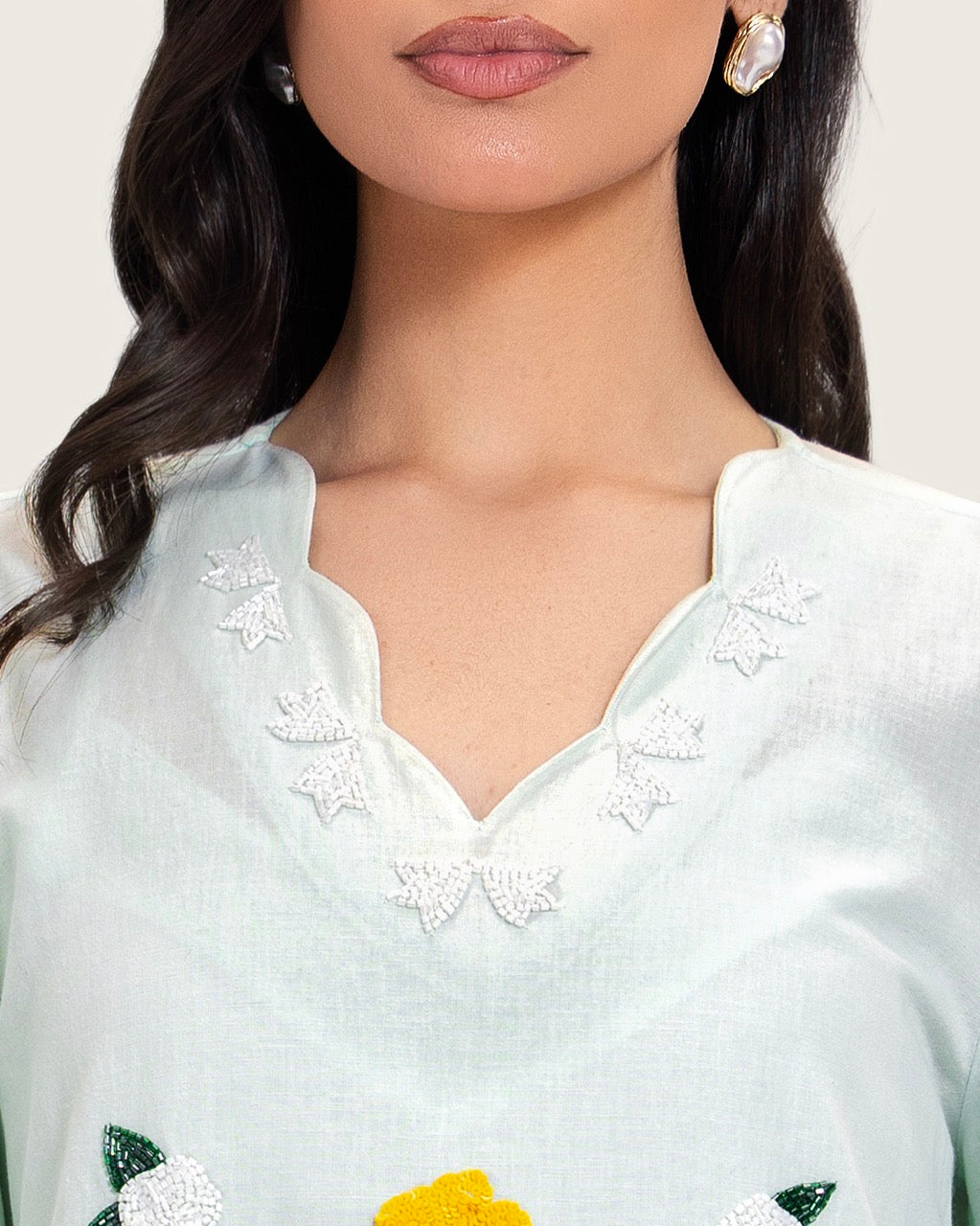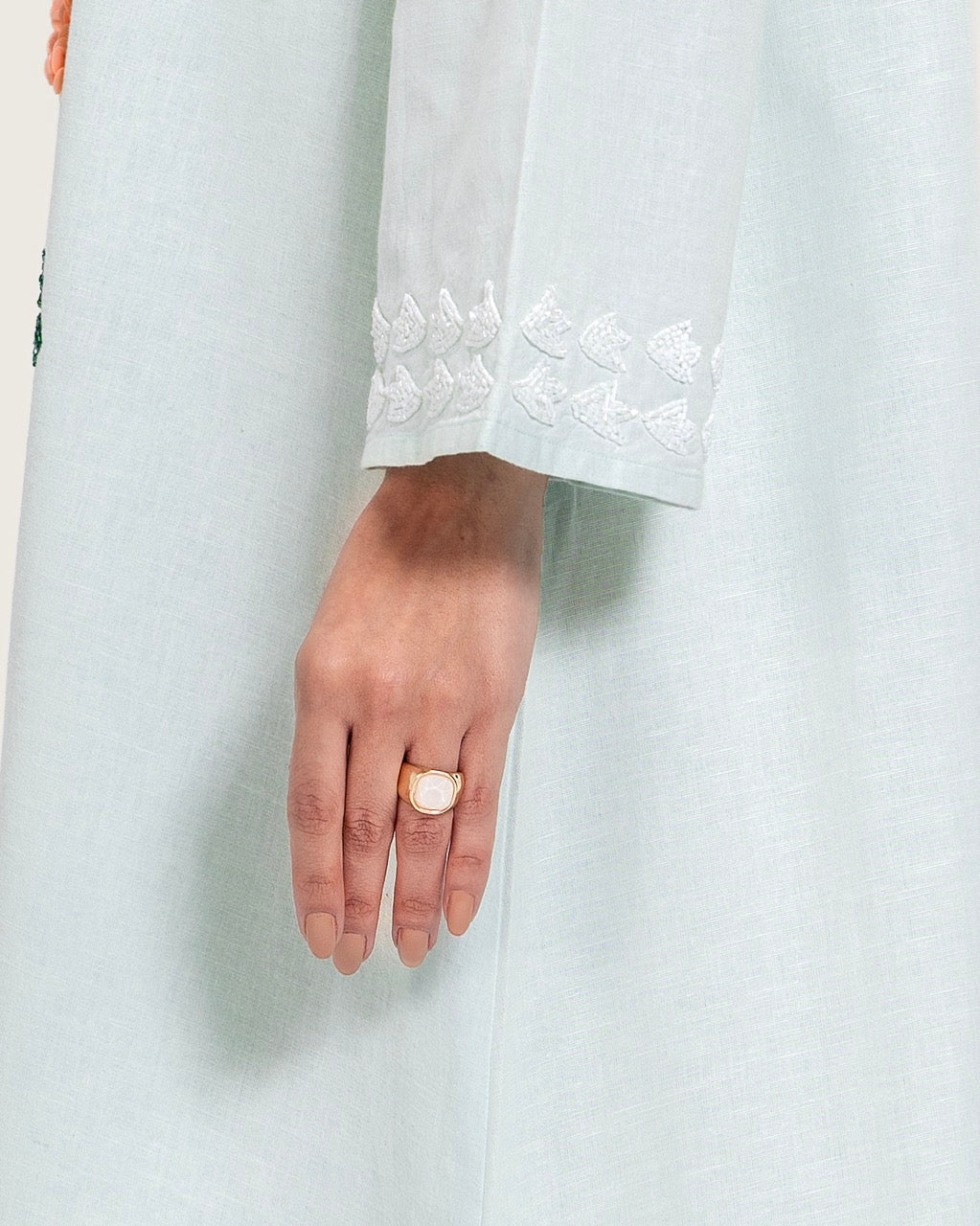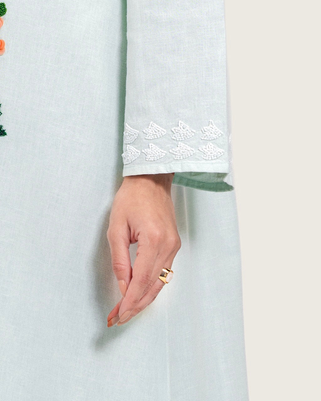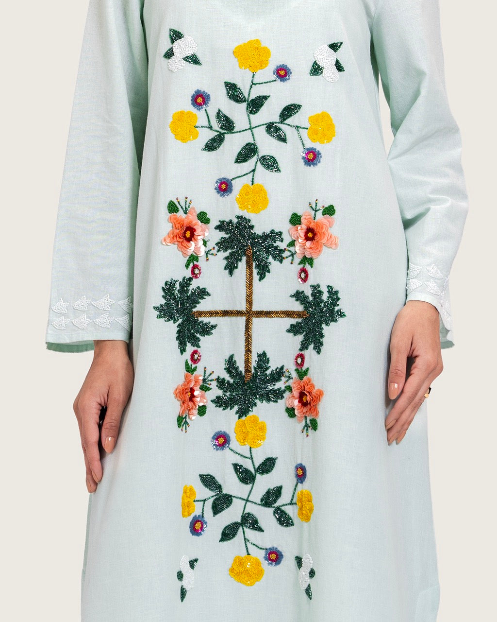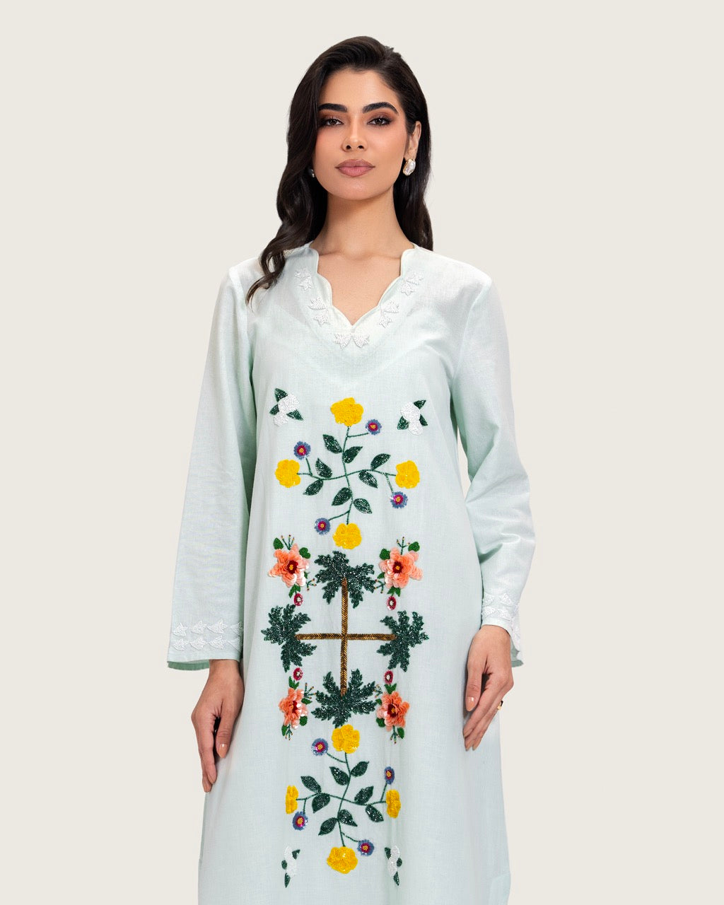 A timeless maxi dress designed with understated elegance and artisanal detail. Crafted from breathable linen, it offers lightweight comfort with a soft, airy feel. Featuring a full-length maxi cut, a relaxed straight silhouette, long sleeves, a subtle neckline, and a scalloped hem, the dress is finished with handcrafted floral embroidery that adds a refined artistic touch. Light to medium in weight, it is ideal for daytime gatherings, Ramadan occasions, travel, and relaxed events. Style with flat sandals for an effortless daytime look or elevate with heels and minimal accessories.
