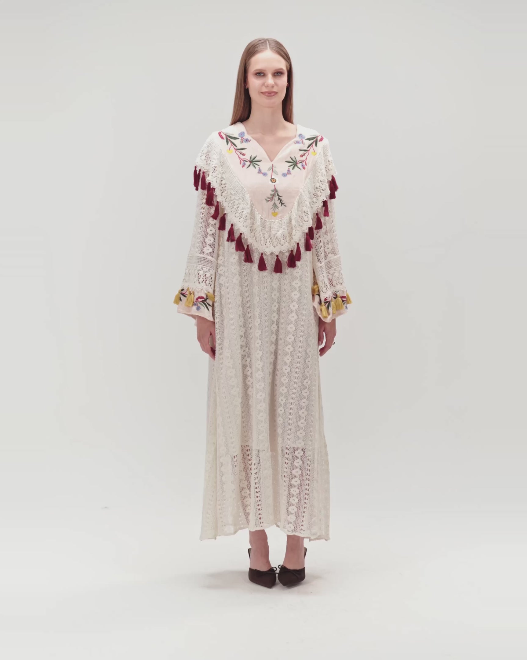 A white kaftan crafted from lightweight cotton lace and velvet. It features hand-embroidered floral details around the scalloped neckline, layered lace panels, and handmade tassels that add artisanal charm.
