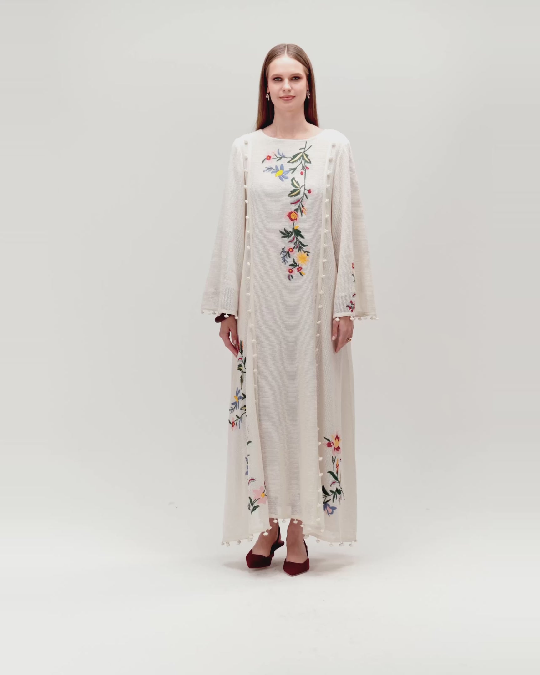 A refined offwhite maxi kaftan crafted from lightweight cotton net fabric, featuring a relaxed straight silhouette and delicate floral embroidery. Perfect for Ramadan gatherings and daytime occasions. Style with classic heels or elegant sandals.